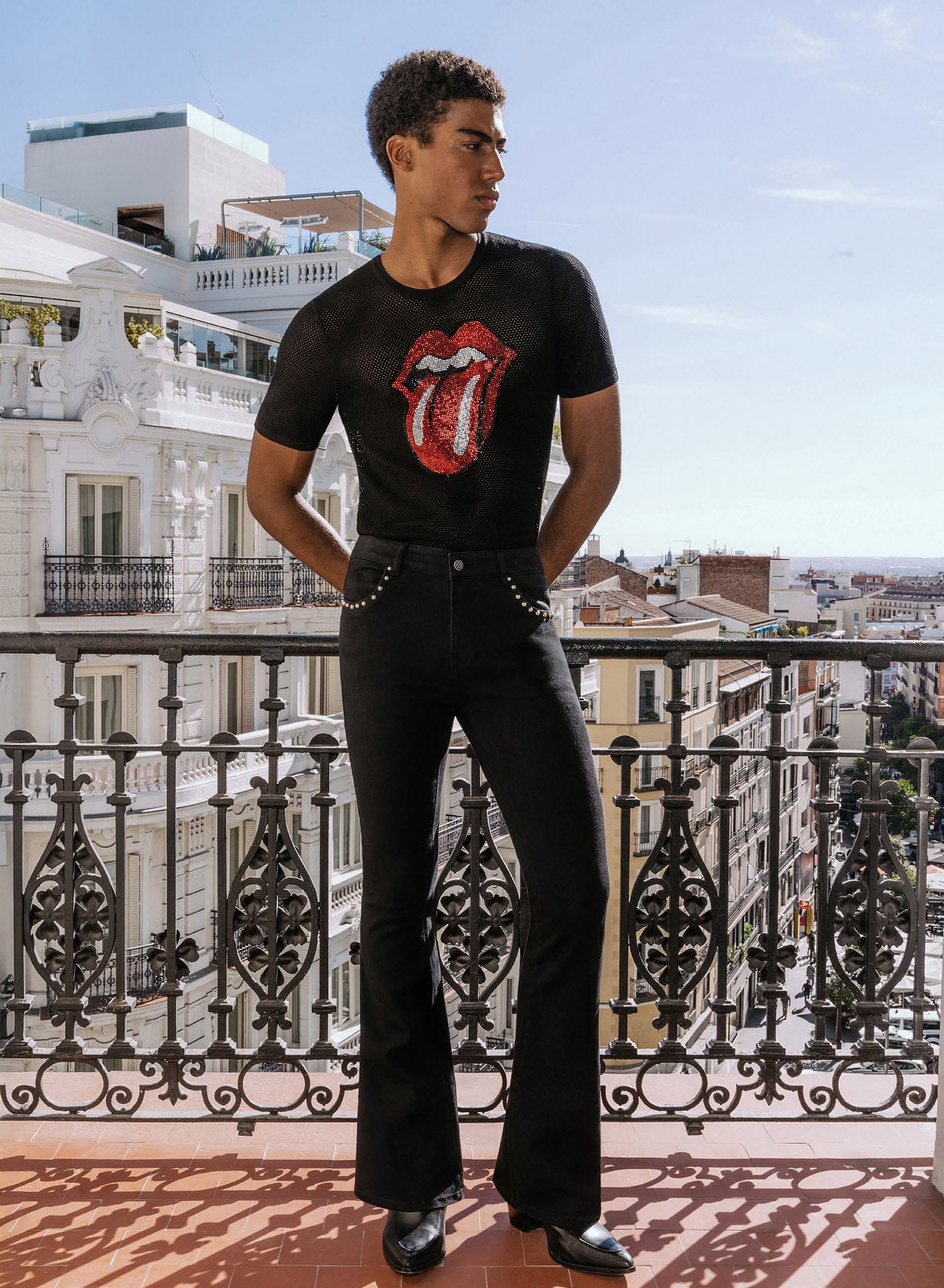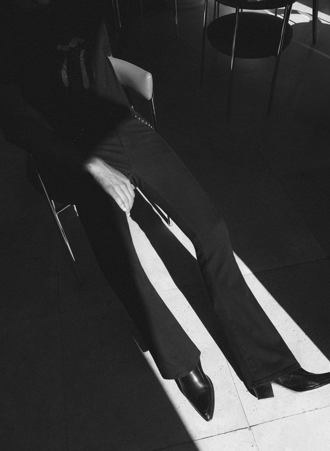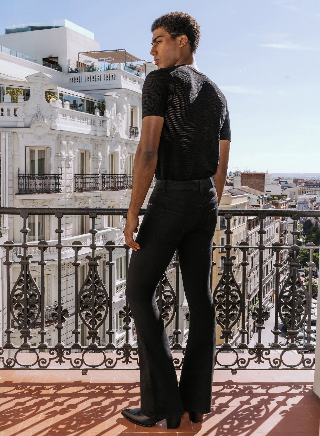 The Black Studded Pocket Trim Denim Flare jeans feature a bold studded pattern along the hems of the front pockets, adding defined detailing to the design. Crafted from premium black denim, they offer a sleek fit before dramatically flaring at the hem, blending statement elements with refined craftsmanship.