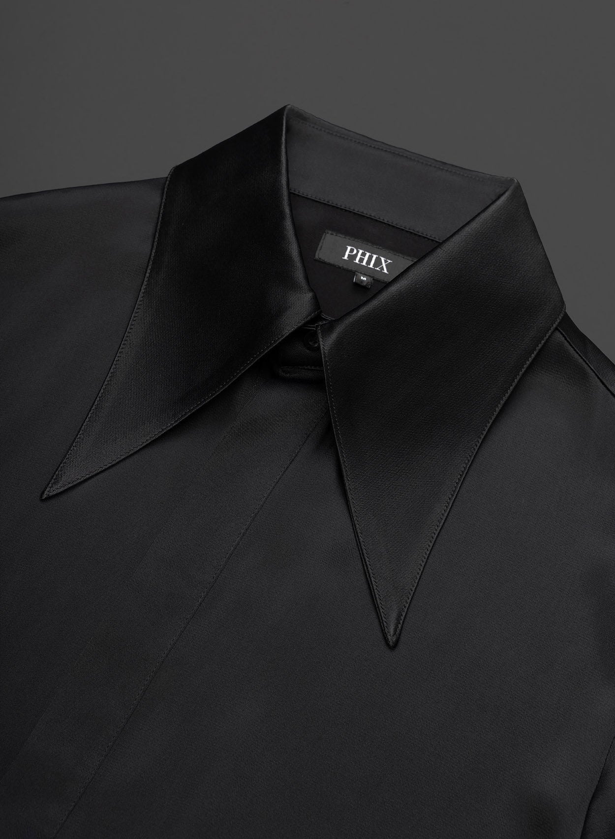 This shirt features an oversized, exaggerated dagger collar that defines its dramatic silhouette. Crafted from a premium 100% viscose fabric, it offers excellent breathability and a superior fluid drape that enhances its sharp fit. The subtle lustre and smooth feel provide a sophisticated finish. The concealed button placket maintains its sleek aesthetic and elevated design. Also available in Brown and Ivory.