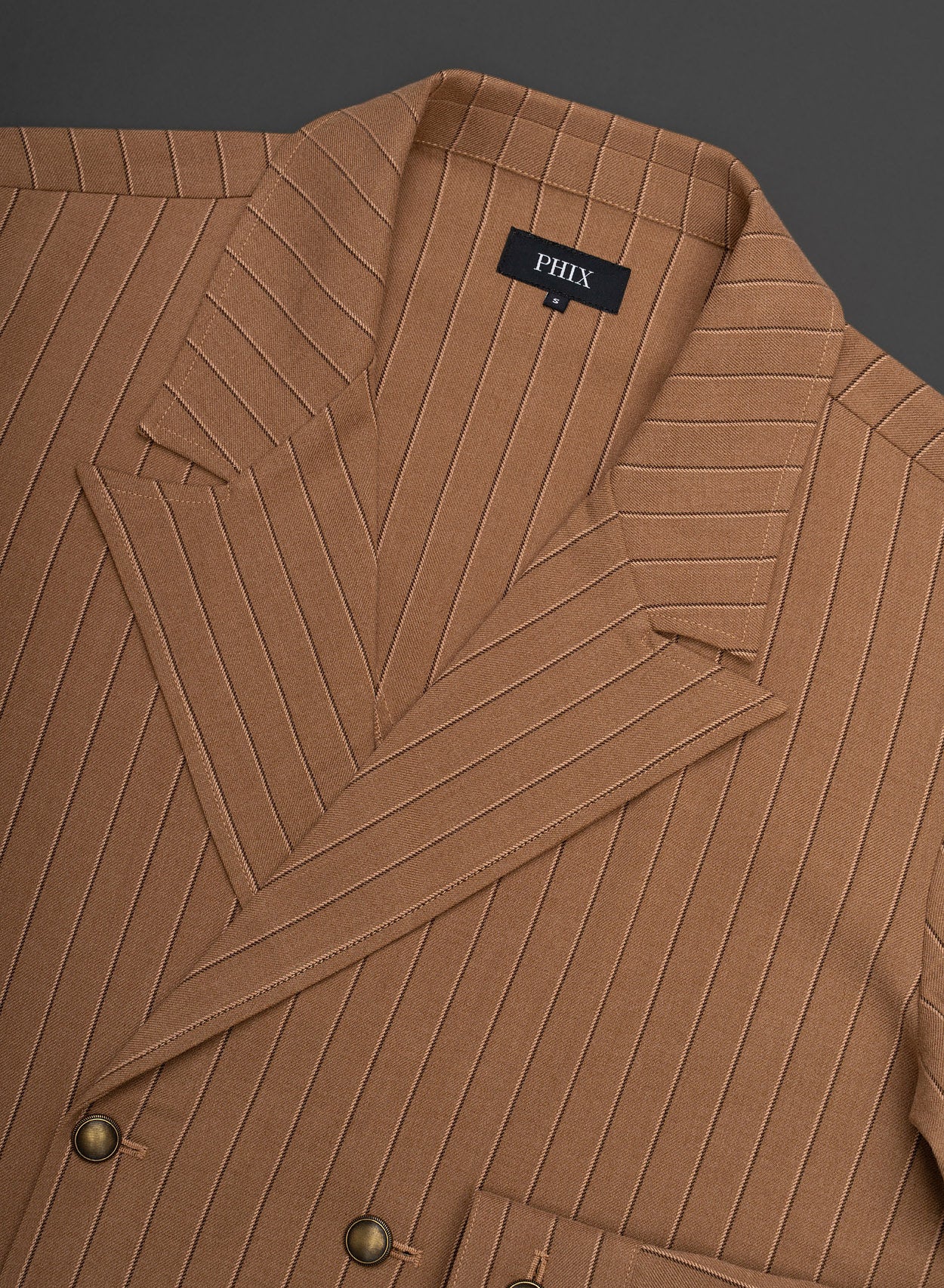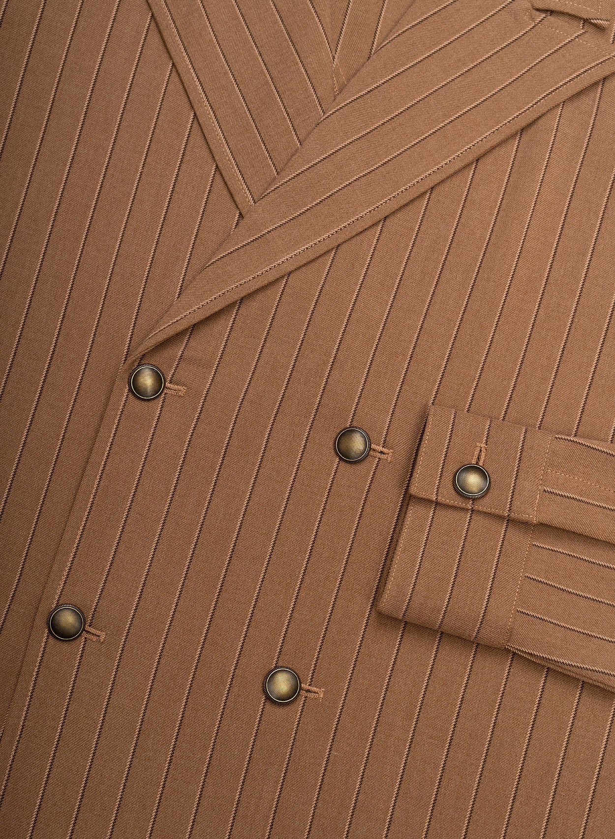 This shirt takes a tailored approach to vintage structure, defined by its double-breasted silhouette and refined brown pinstripe detailing. Tailored for a slim fit with notched lapels and fitted cuffs, it provides a sleek structure and confident silhouette. The shirt is finished with striking brass buttons that complement the rich brown hue.