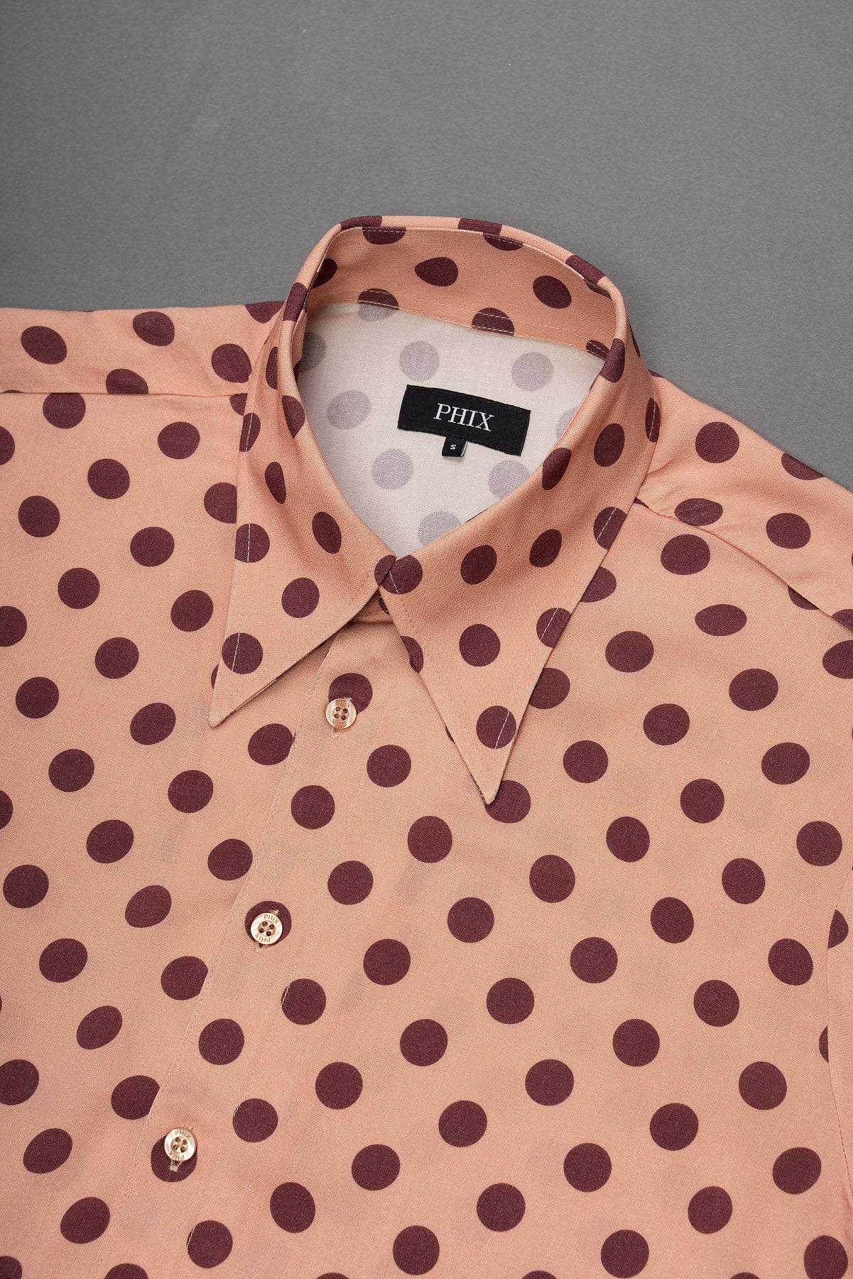 A soft pink shirt defined by a bold all-over polka dot print in a rich brown tone, creating a strong, graphic contrast.
