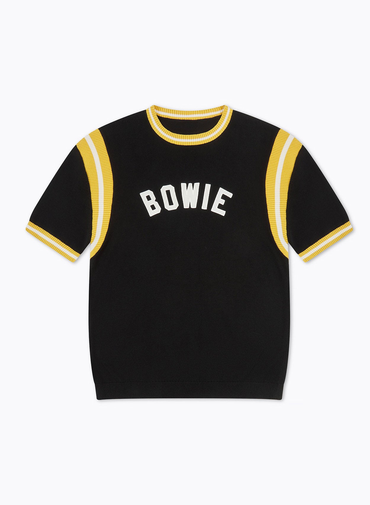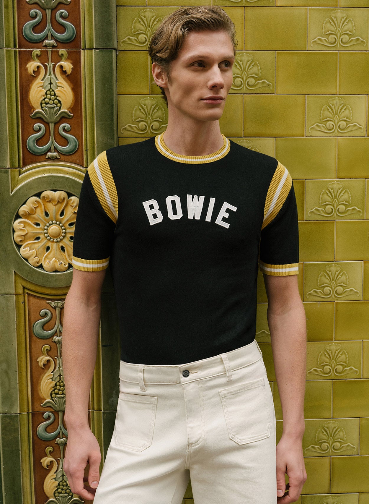 A tribute to the legend. This official Phix X David Bowie knit polo delivers an iconic statement with bold "BOWIE" stencil lettering on the chest. Crafted from a soft, breathable cotton knit fabric for everyday comfort. The retro aesthetic is defined by yellow and white contrasting trims along the neckline and sleeves for a confident, 70s-inspired style.
