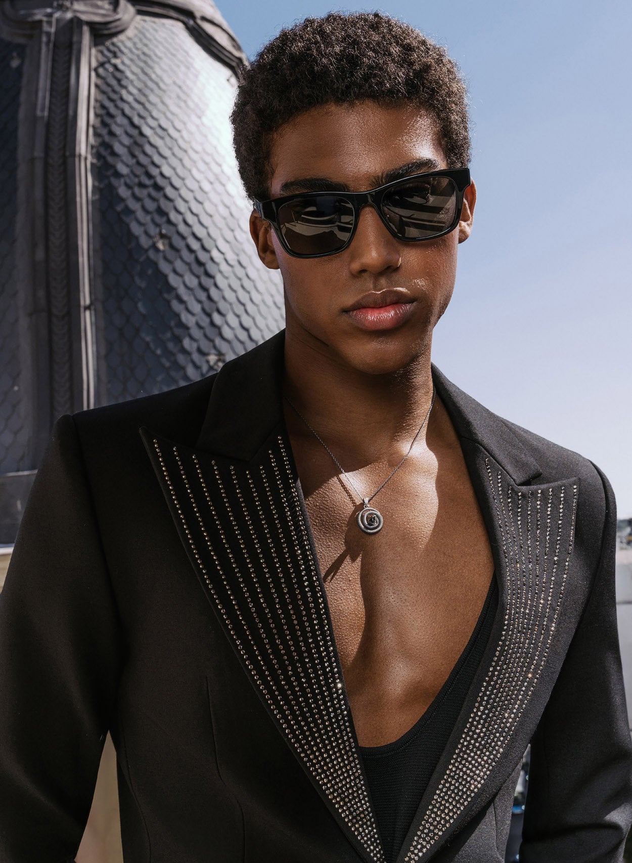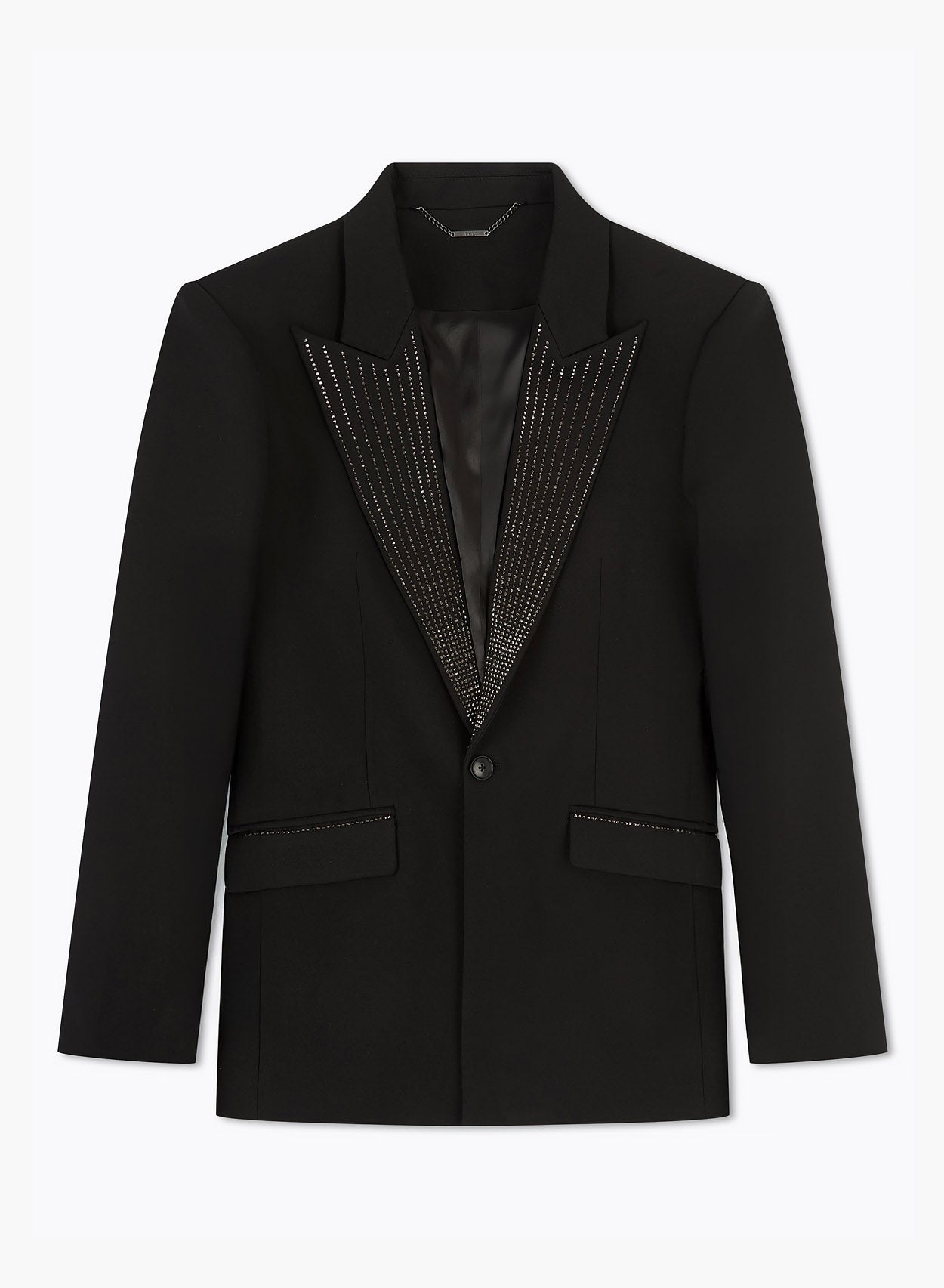 Structure and shine. This blazer offers a contemporary boxy fit and exaggerated notched lapels, with a luxurious finish. The tailoring is enhanced by shimmering rhinestone pinstripe detailing along the lapel and pockets, designed to catch and reflect the light. Finished with a clean vent at the back for ease of movement, this piece delivers a confident and distinctive style.