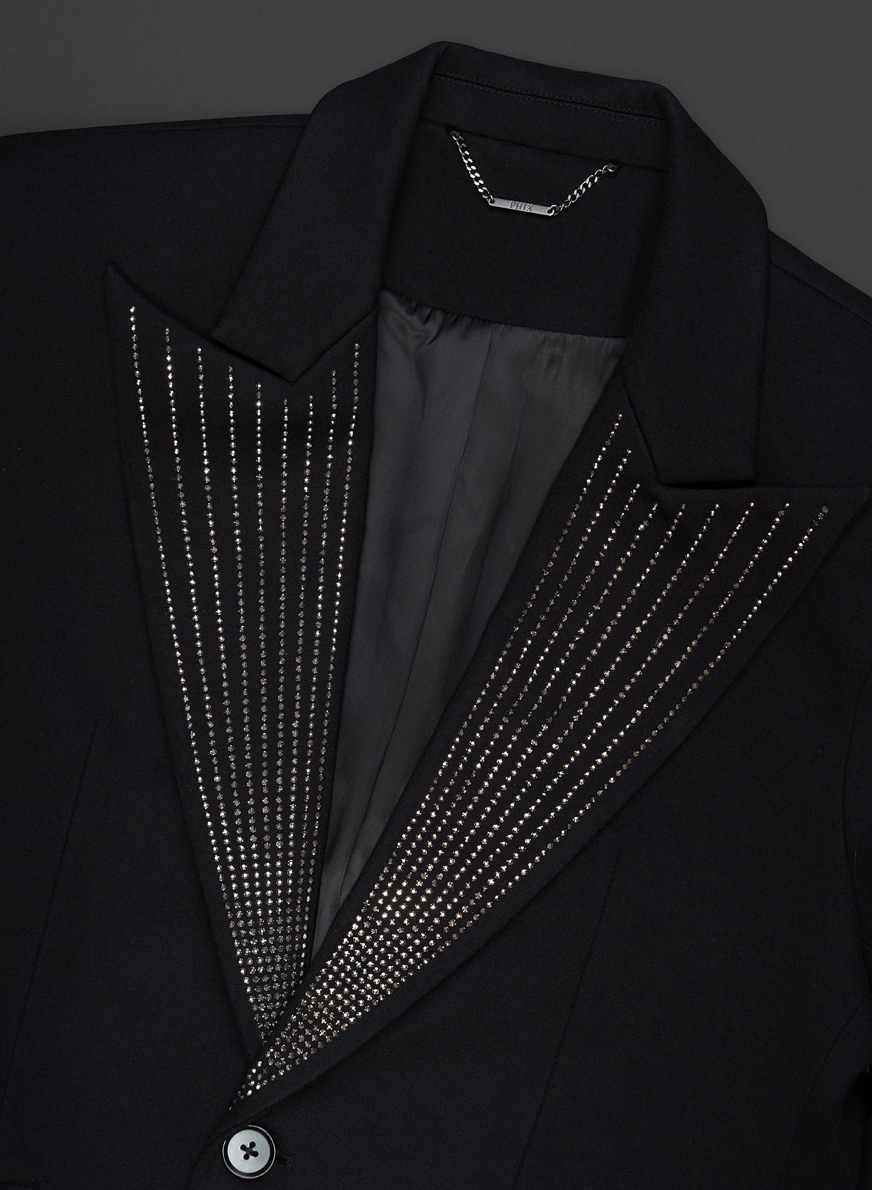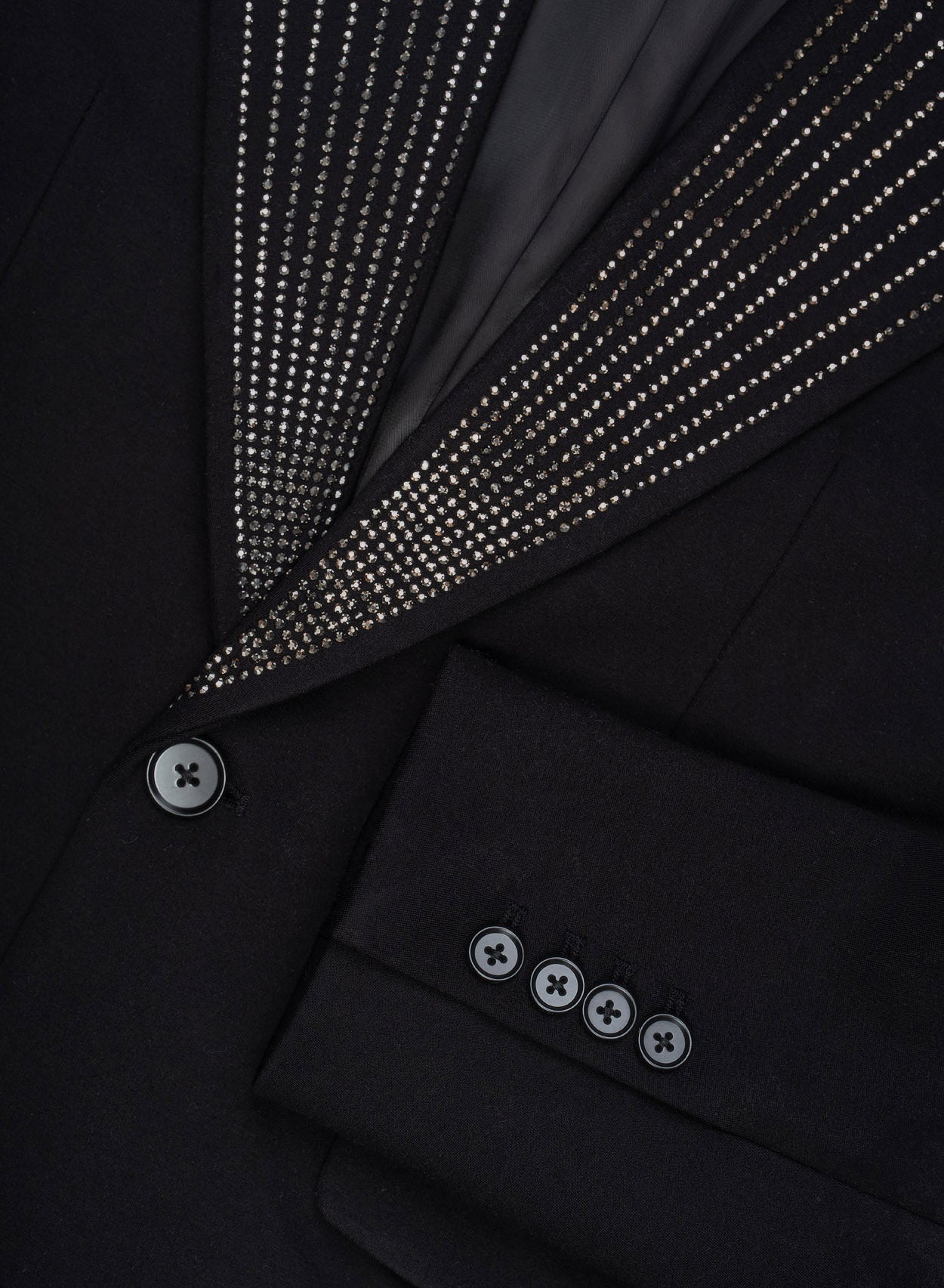 - Shimmering rhinestone pinstripe detailing on lapels and pockets
