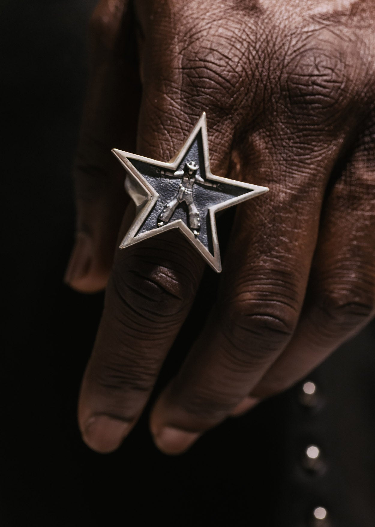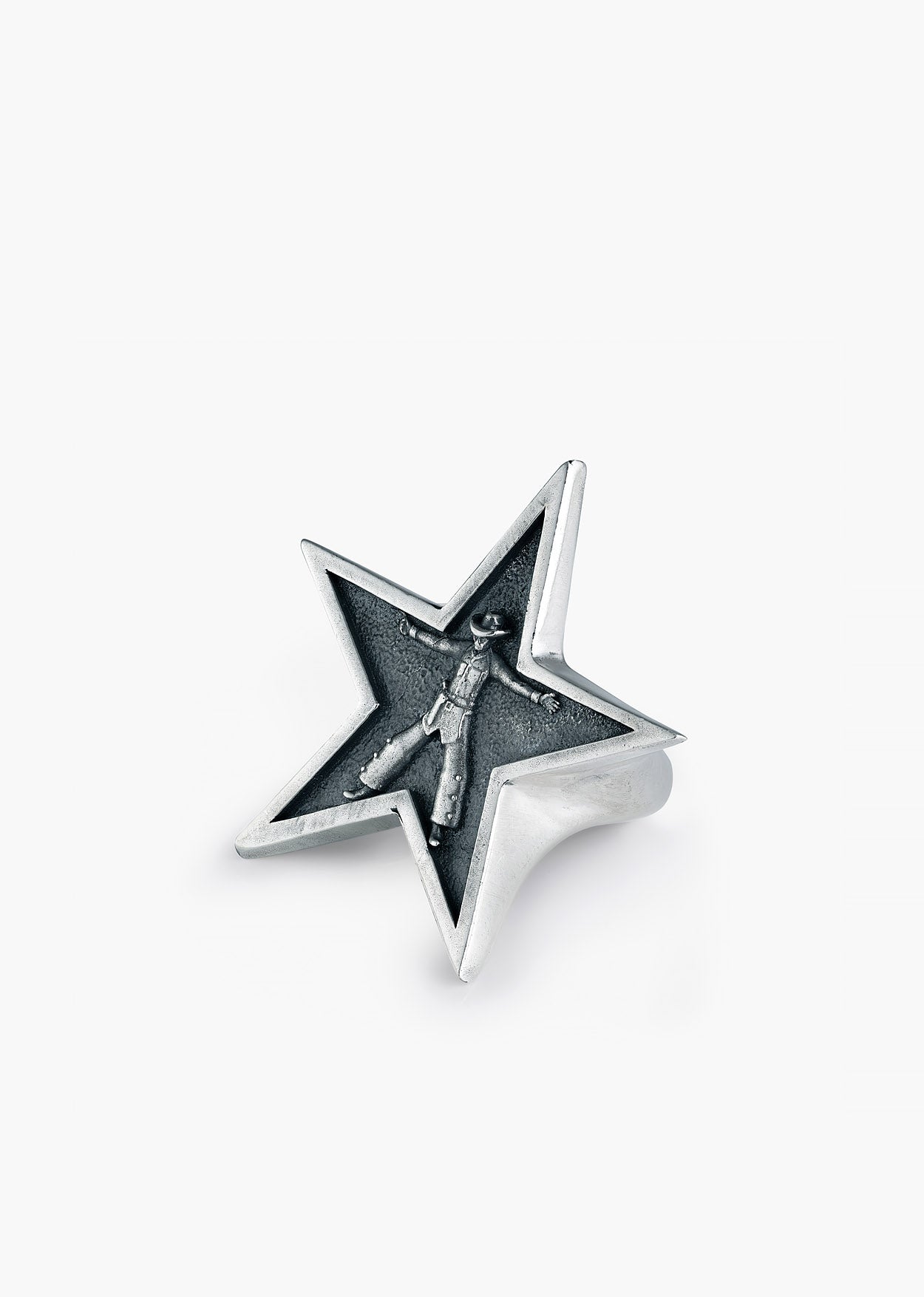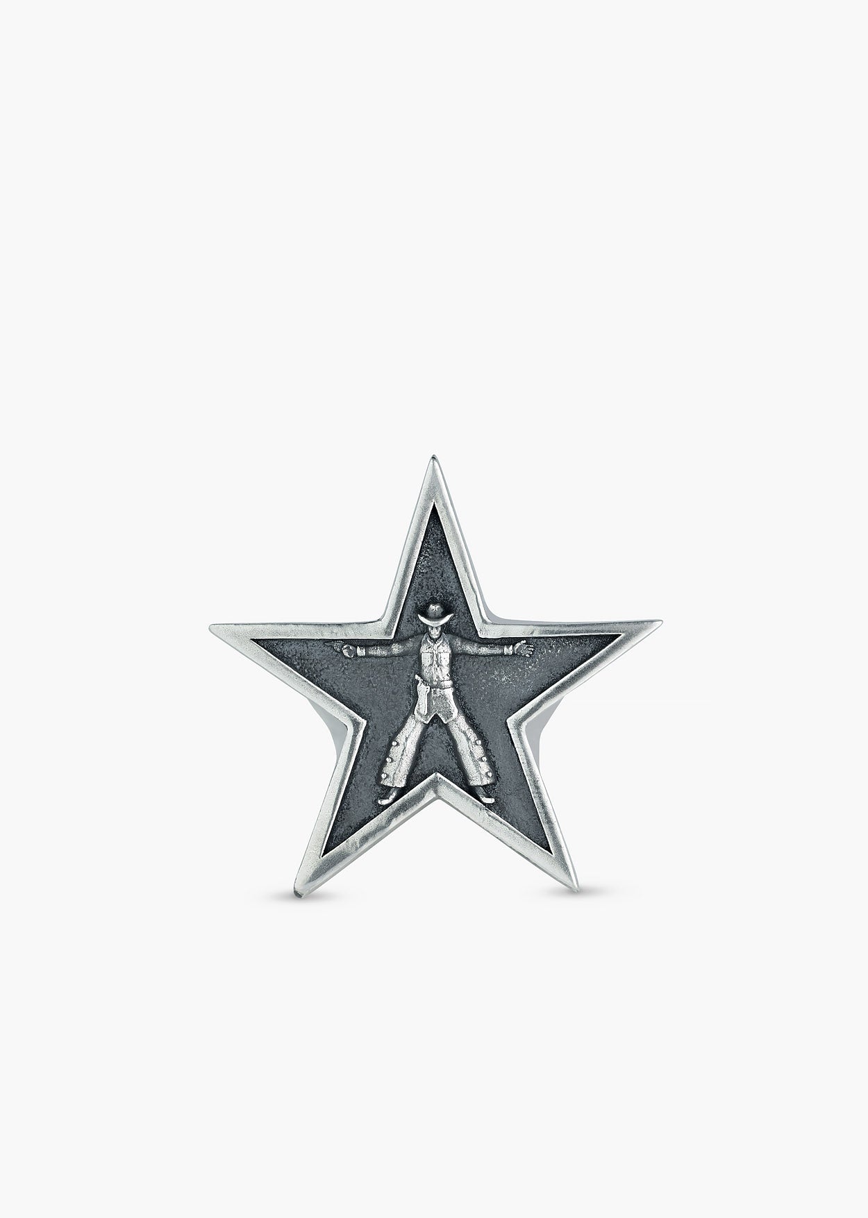 Defined by its star silhouette, this ring features a prominent, intricately carved cowboy figure at its center. The figure is set against a deeply oxidised background that enhances the texture and detail of the design. Handcrafted from silver-plated brass in India and engraved with the PHIX logo, this piece commands attention with its authentic Western attitude.