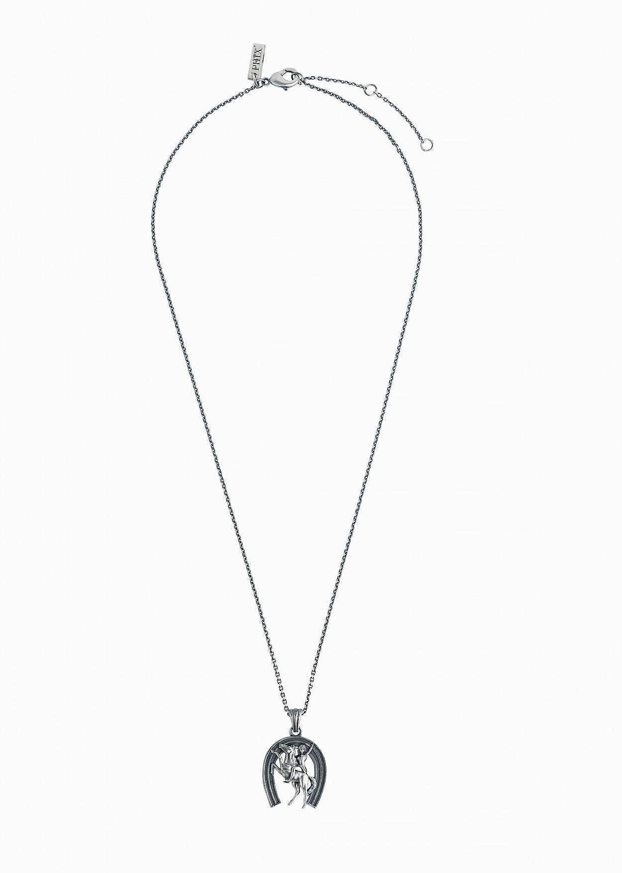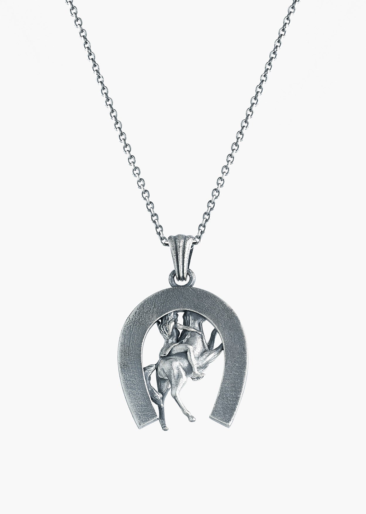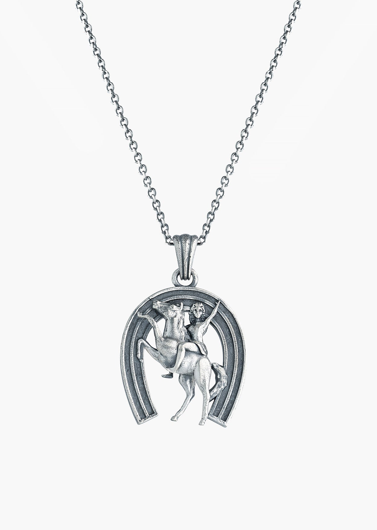 A powerful symbol of Western iconography, this necklace features a detailed pendant of a rider on a rearing horse framed within an inverted horseshoe silhouette. The highly detailed centerpiece is set against a dark, oxidised background that enhances the relief texture and depth of the design. The pendant is suspended from a complementing oxidised chain. Handcrafted from silver-plated brass in India.
