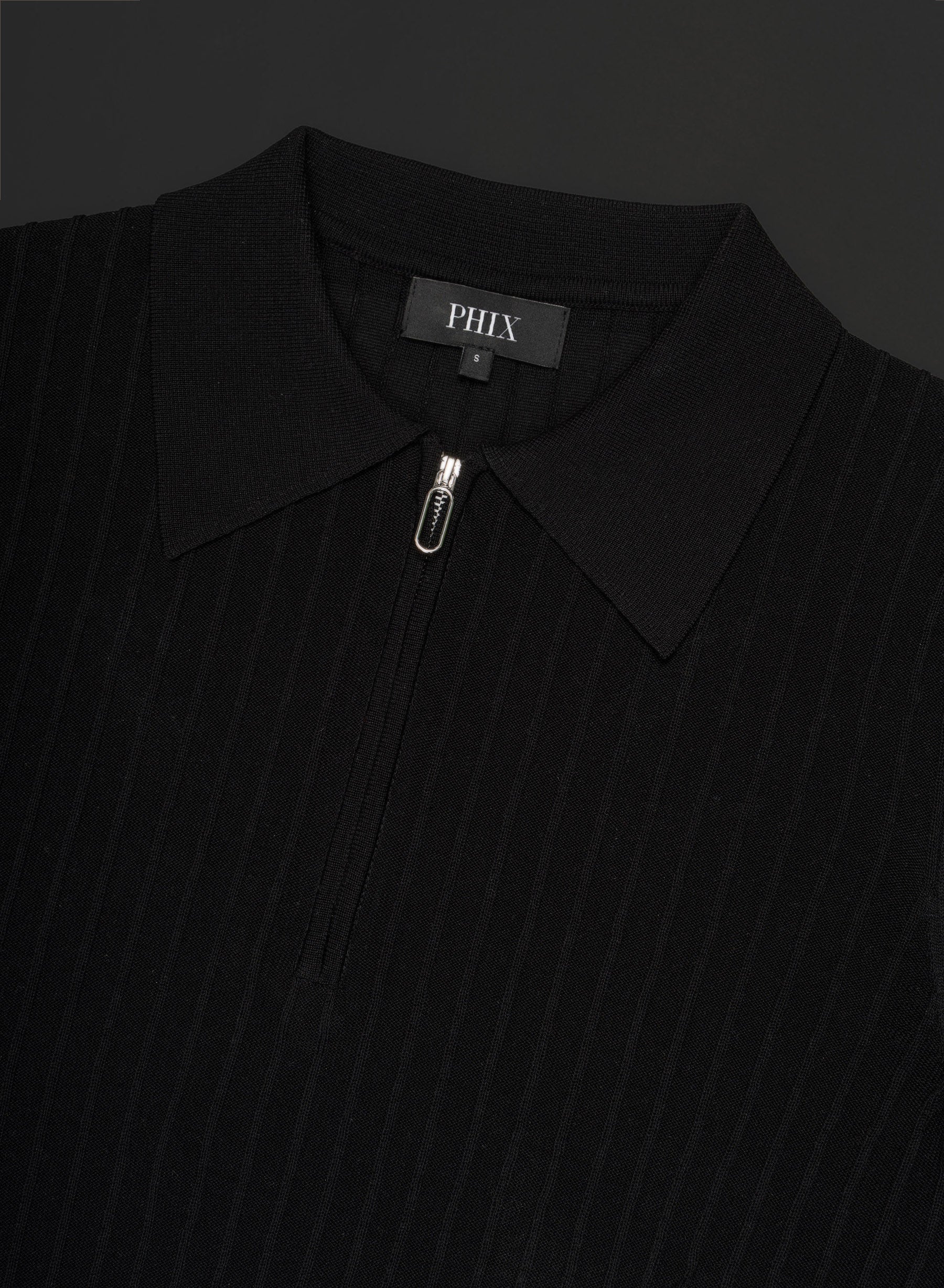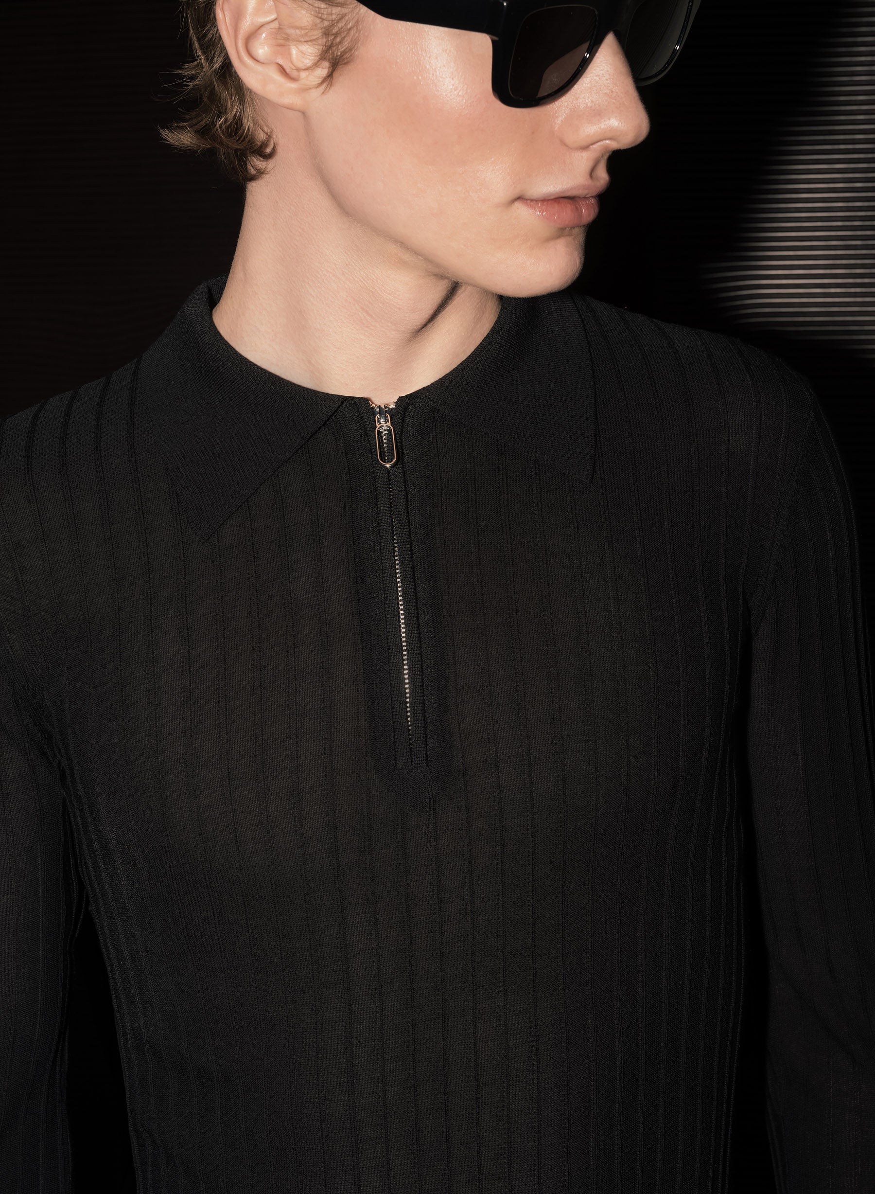 A refined long sleeve polo knitted in a premium lyocell and silk blend, selected for its breathability and soft feel against the skin. The ribbed construction gives subtle structure through the body while allowing natural movement.