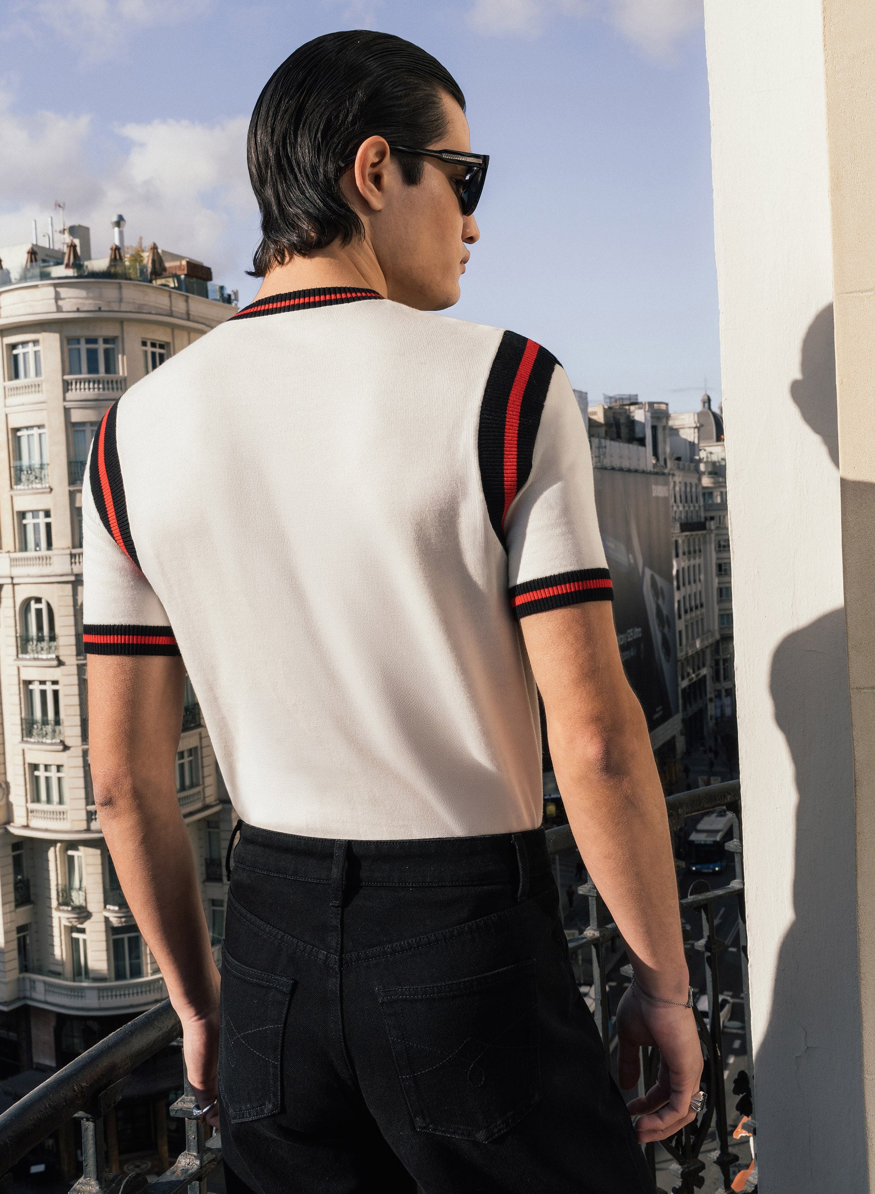I can’t get no satisfaction. This knit polo delivers a graphic statement inspired by the Rolling Stones’ iconic lyric. The design features a crisp white base with contrasting red and black trims at the neckline and sleeves with the phrase stitched across the chest.