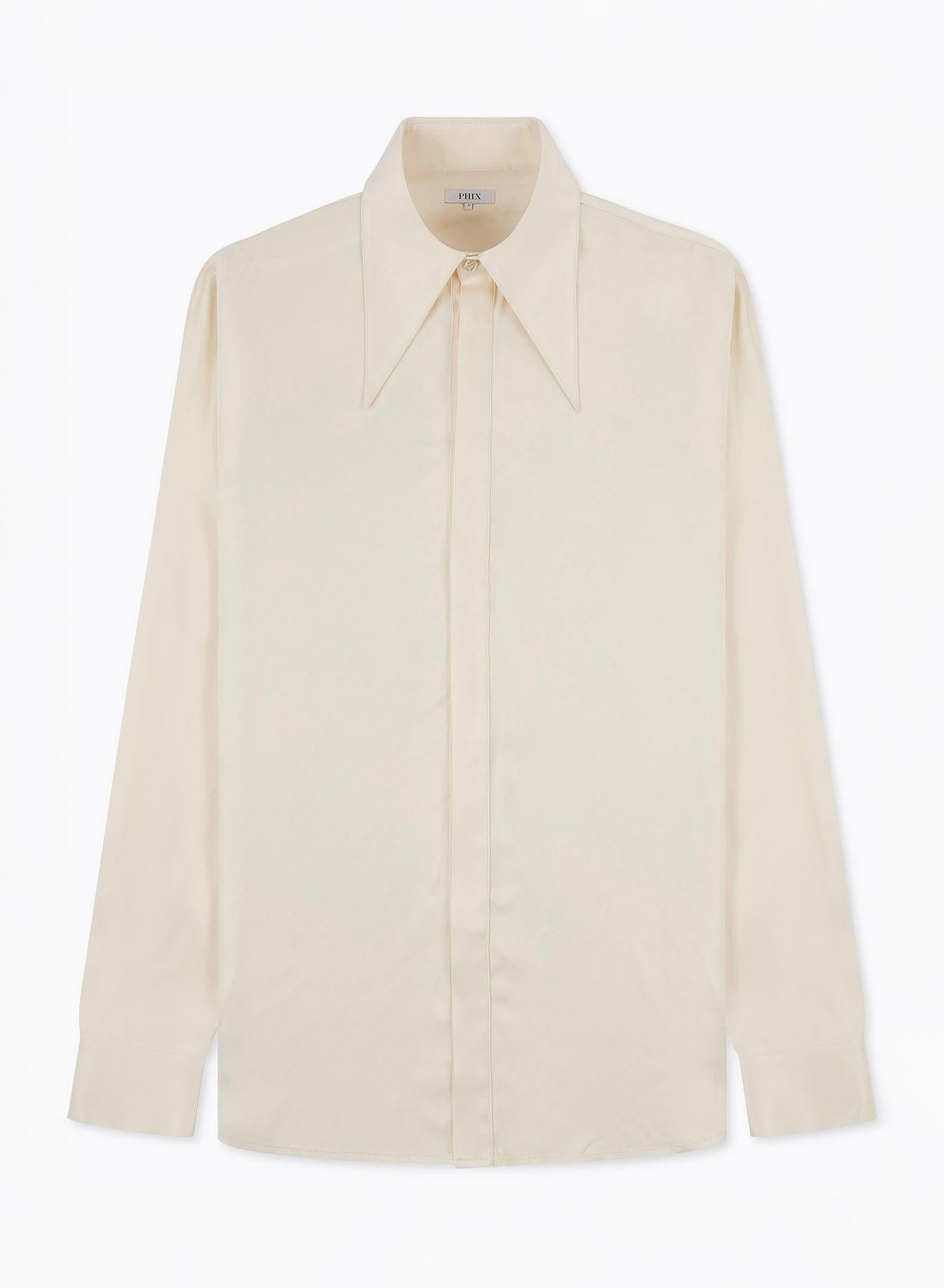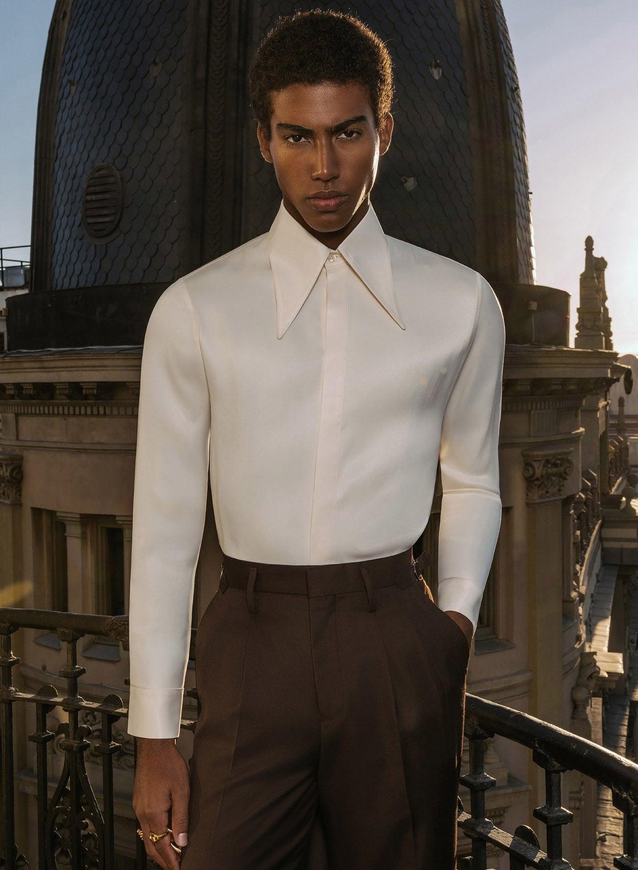 This shirt features an oversized, exaggerated dagger collar that defines its dramatic silhouette. Crafted from a premium 100% viscose fabric, it offers excellent breathability and a superior fluid drape that enhances its sharp fit. The subtle lustre and smooth feel provide a sophisticated finish. The concealed button placket maintains its sleek aesthetic and elevated design. Also available in Brown and Black.