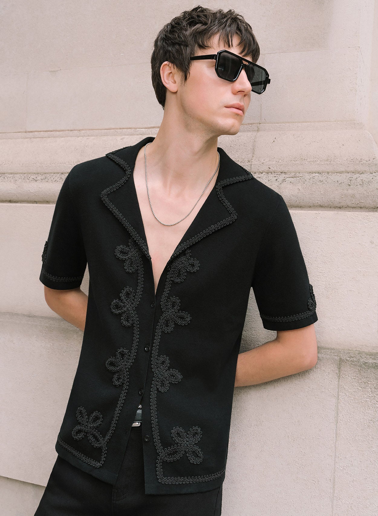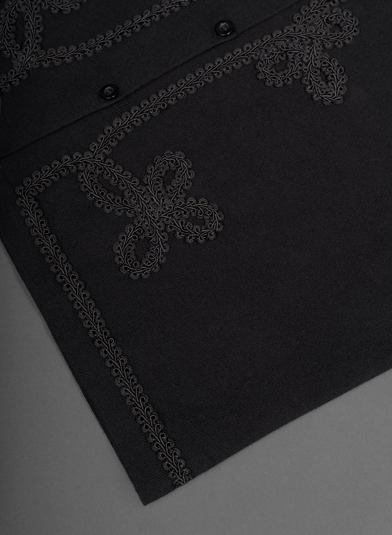 Embellished by floral rope embroidery set in an elegant black trim, a captivating contrast is created against the sleek black base. Each detail is thoughtfully finished with embossed monogram buttons in matching black.