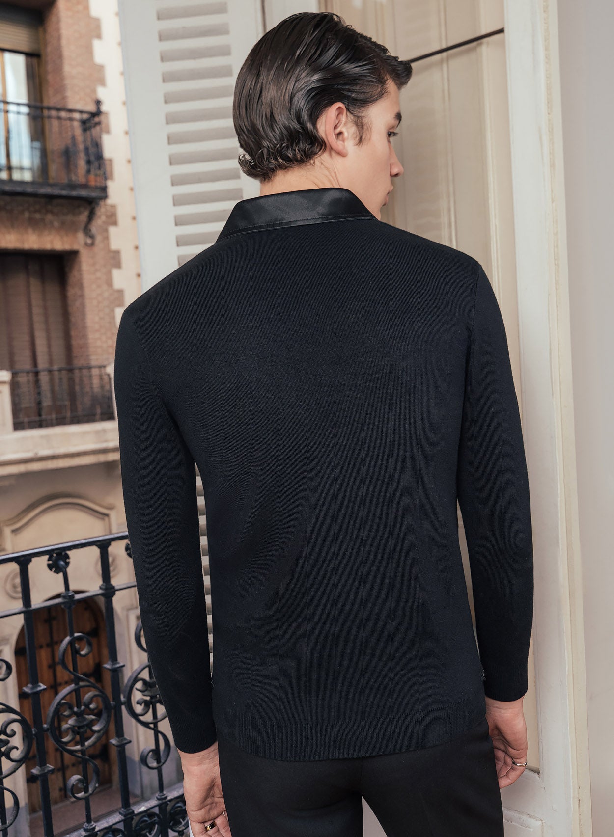 This long-sleeved polo, crafted from premium cotton, offers modern elegance and refined sophistication. The all-black embroidery contributes a subtle yet captivating texture, creating a sleek monochromatic look that exudes understated luxury. The satin collar adds a touch of opulence, providing a smooth contrast to the matte fabric.
