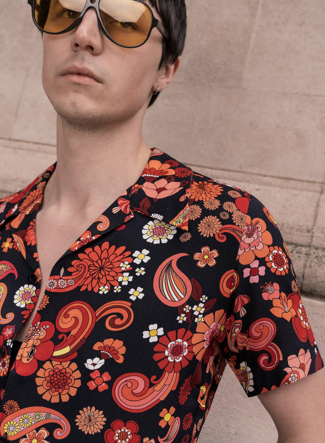This short-sleeve shirt features a rich floral and paisley print in warm, vibrant tones. Crafted from lightweight viscose, it offers a relaxed yet tailored fit for effortless styling. The open collar adds a vintage-inspired touch, making it perfect for both casual and statement looks.
