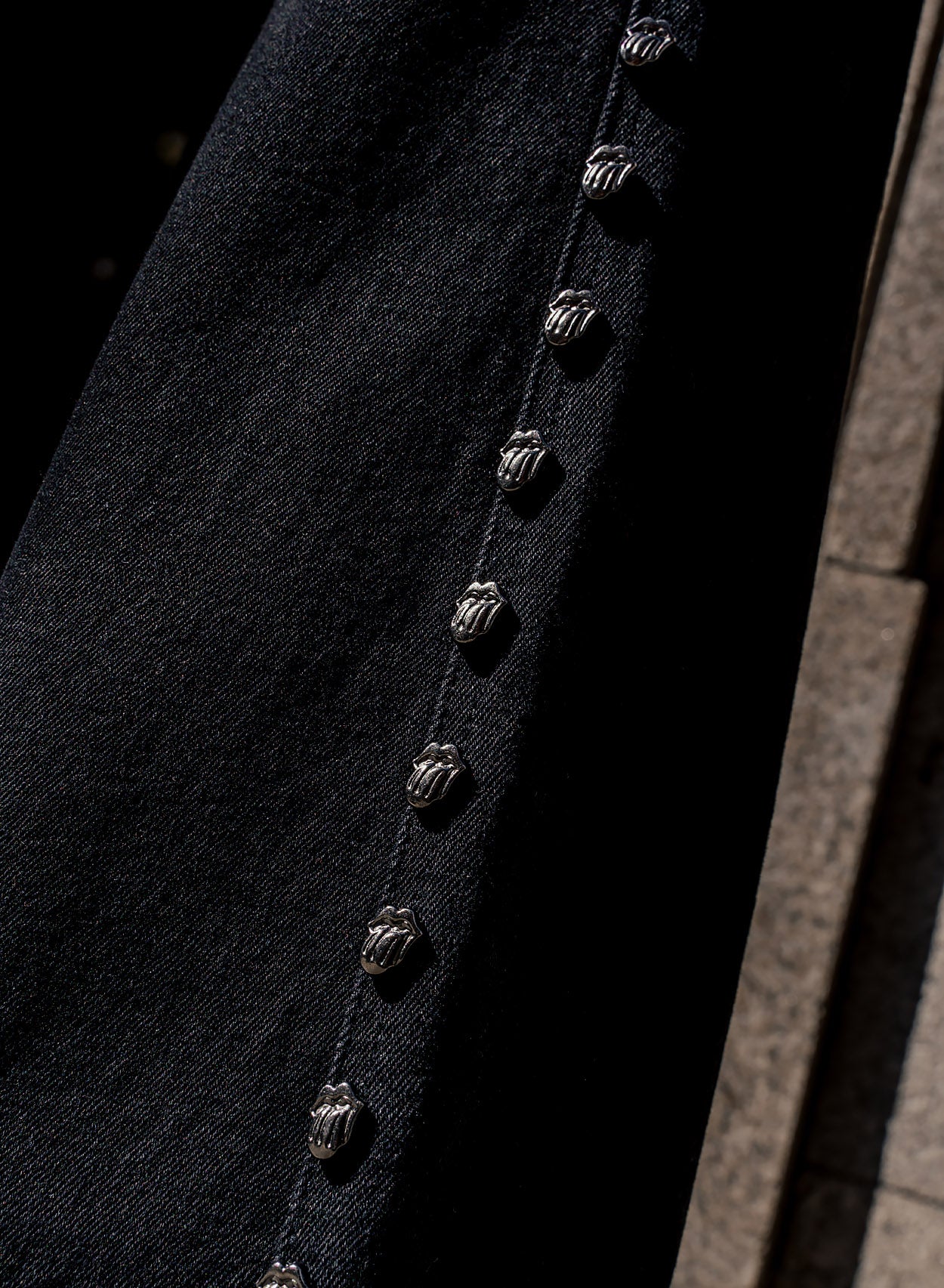 The exclusive Rolling Stones black studded logo denim flare jeans feature high-quality black denim with a distinctive line of studded embellishments running down each leg. Engraved popper buttons showcase the signature Rolling Stones tongue logo, adding a touch of sophistication to the design. These jeans seamlessly blend style and comfort, making them versatile for both casual and dressier tops.