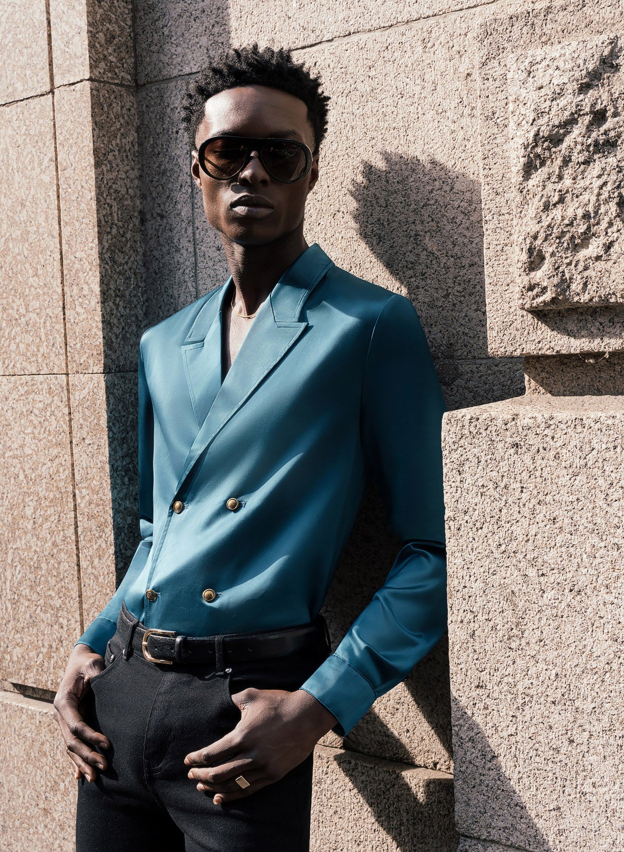 Crafted from smooth blue satin, this shirt features a double-breasted silhouette for sophistication. Tailored for a slim fit with notched lapels alongside fitted cuffs, it provides a sleek and refined look in a bold colour ideal for events and formal occasions.