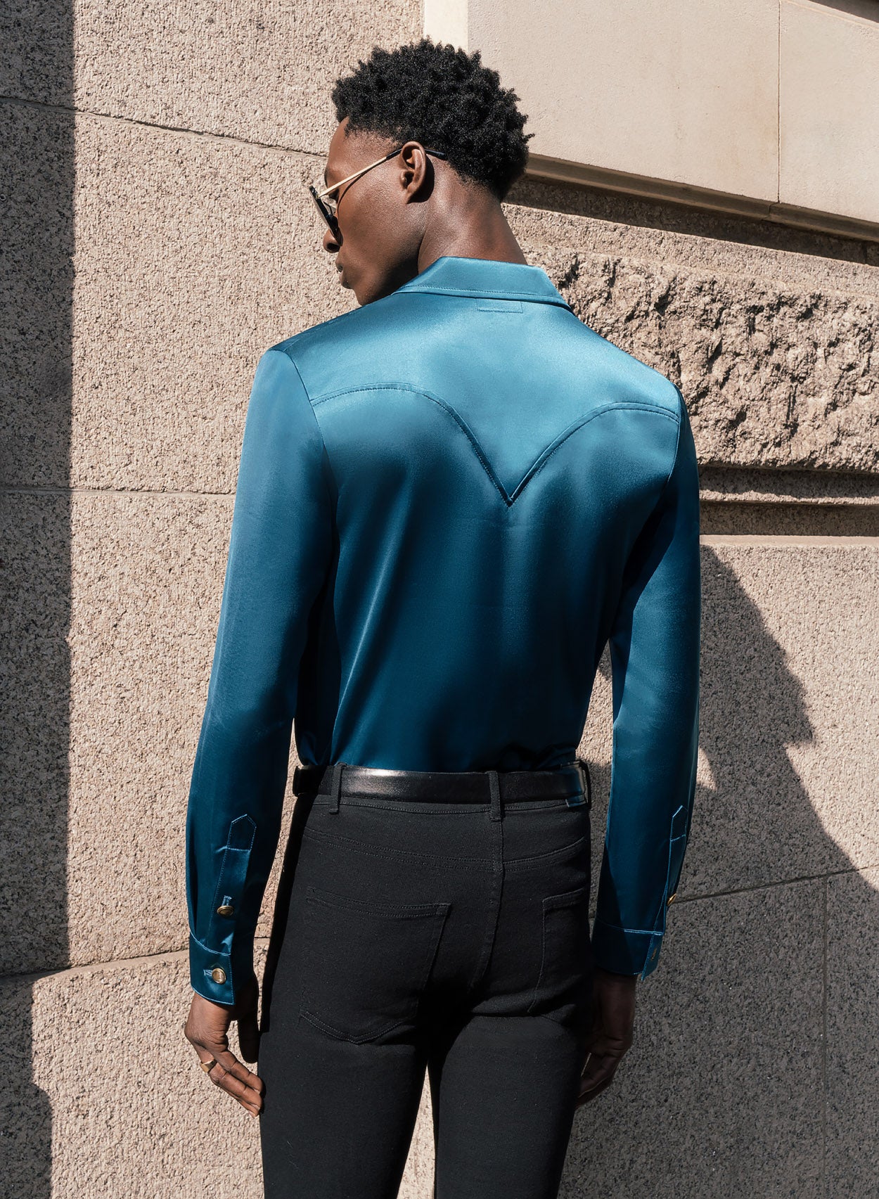Teal Blue Double Breasted Brass Button Satin Shirt