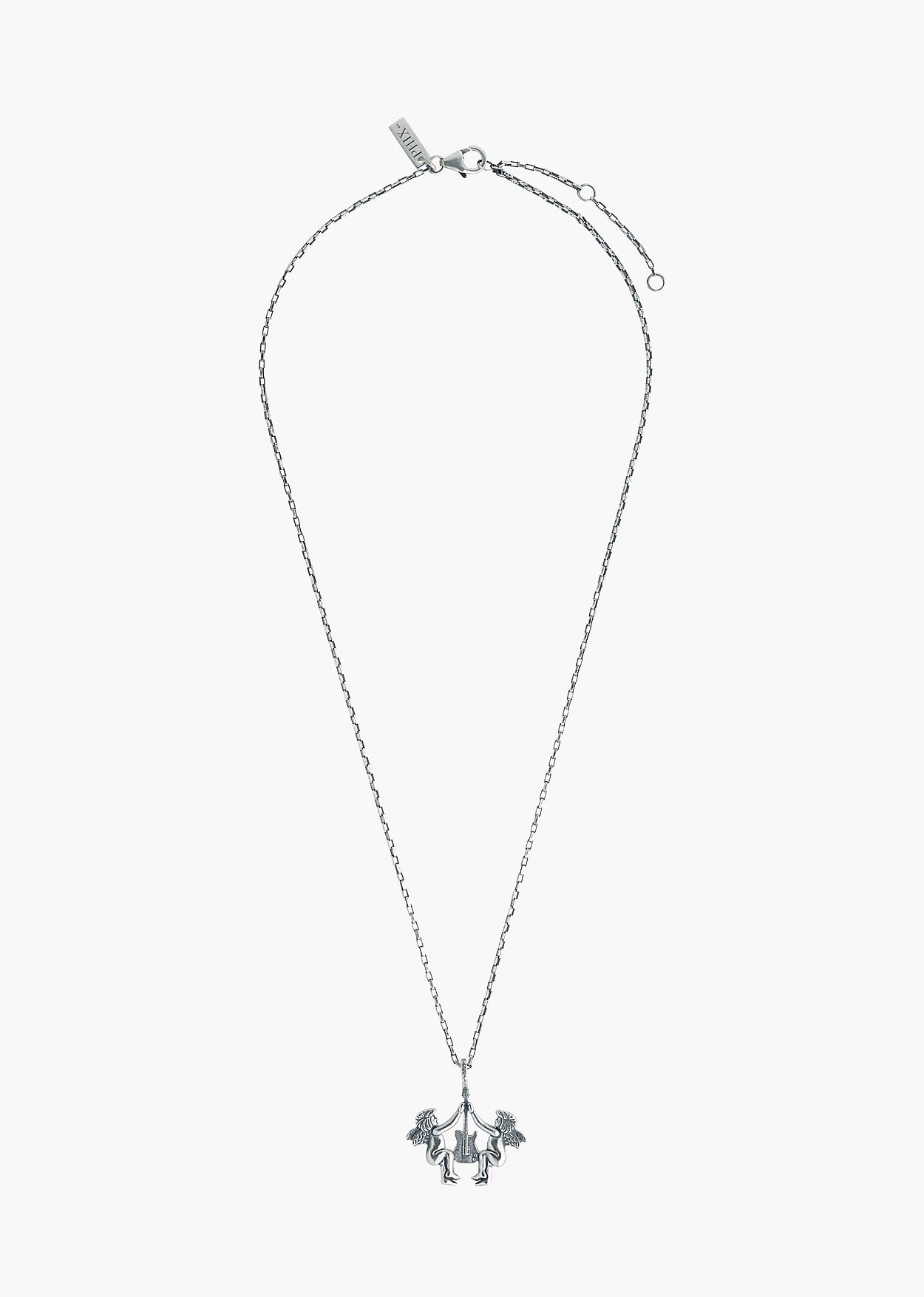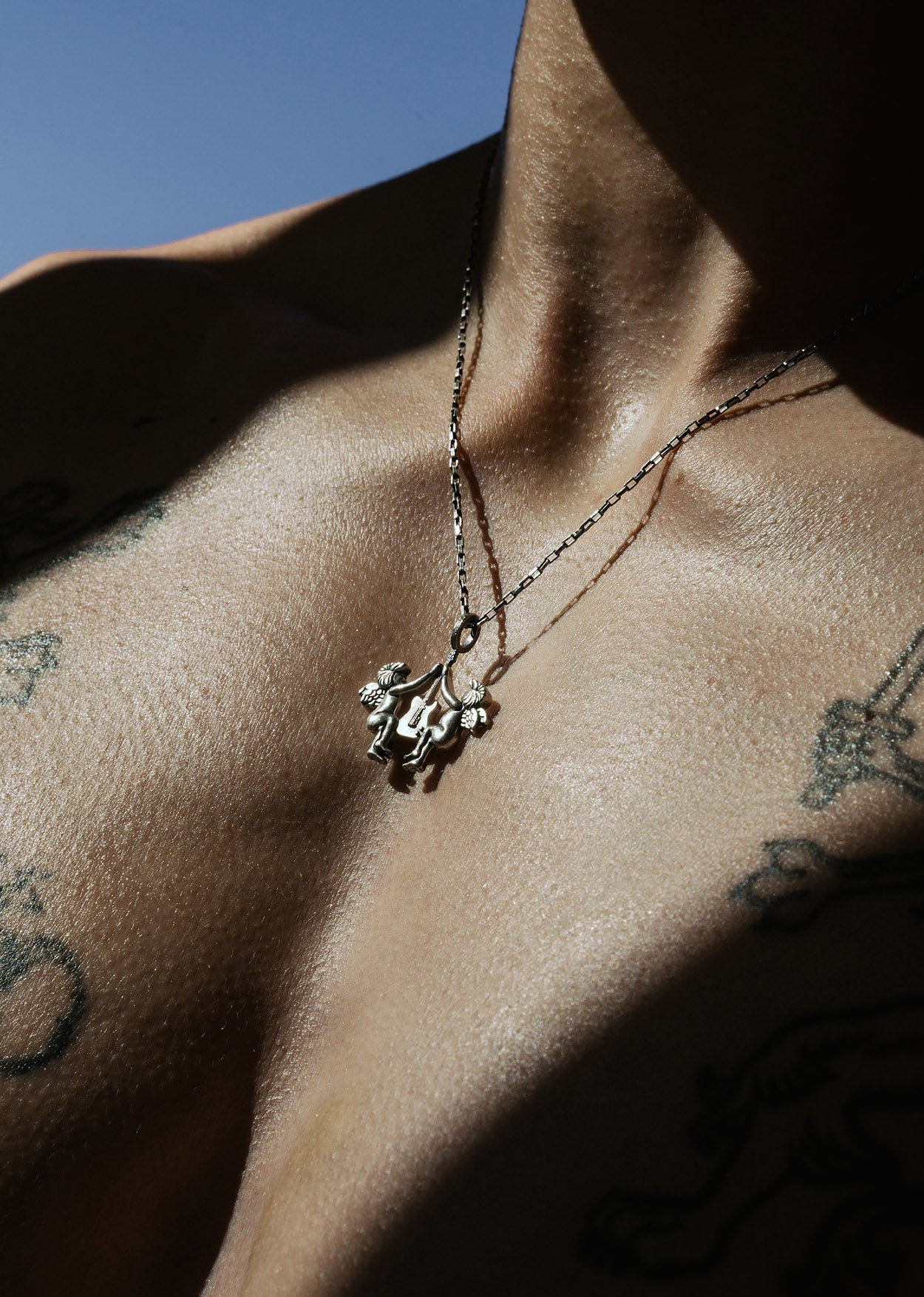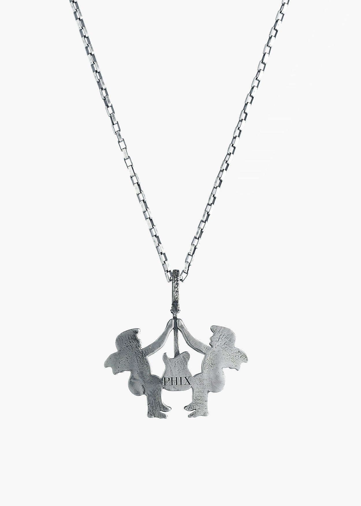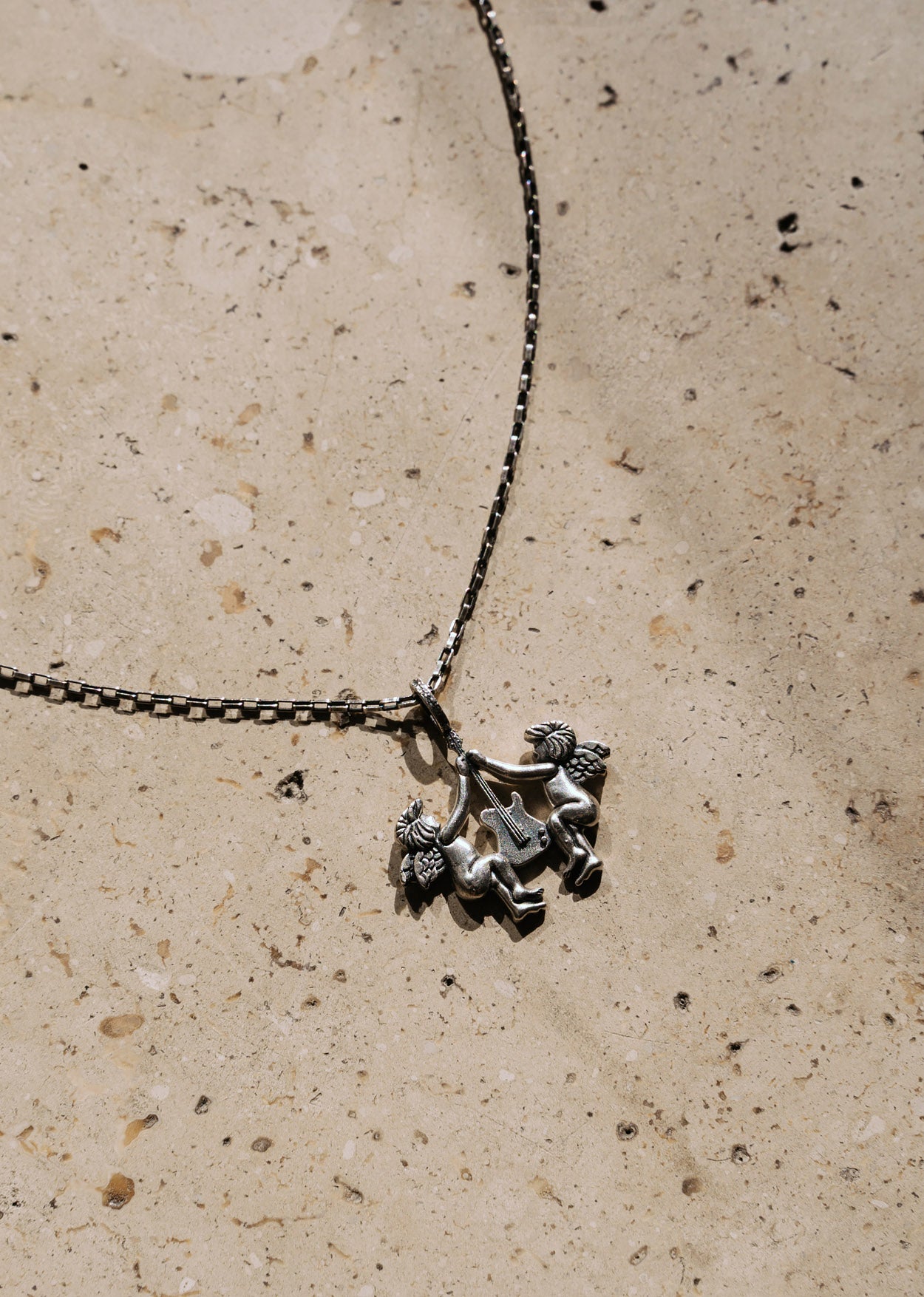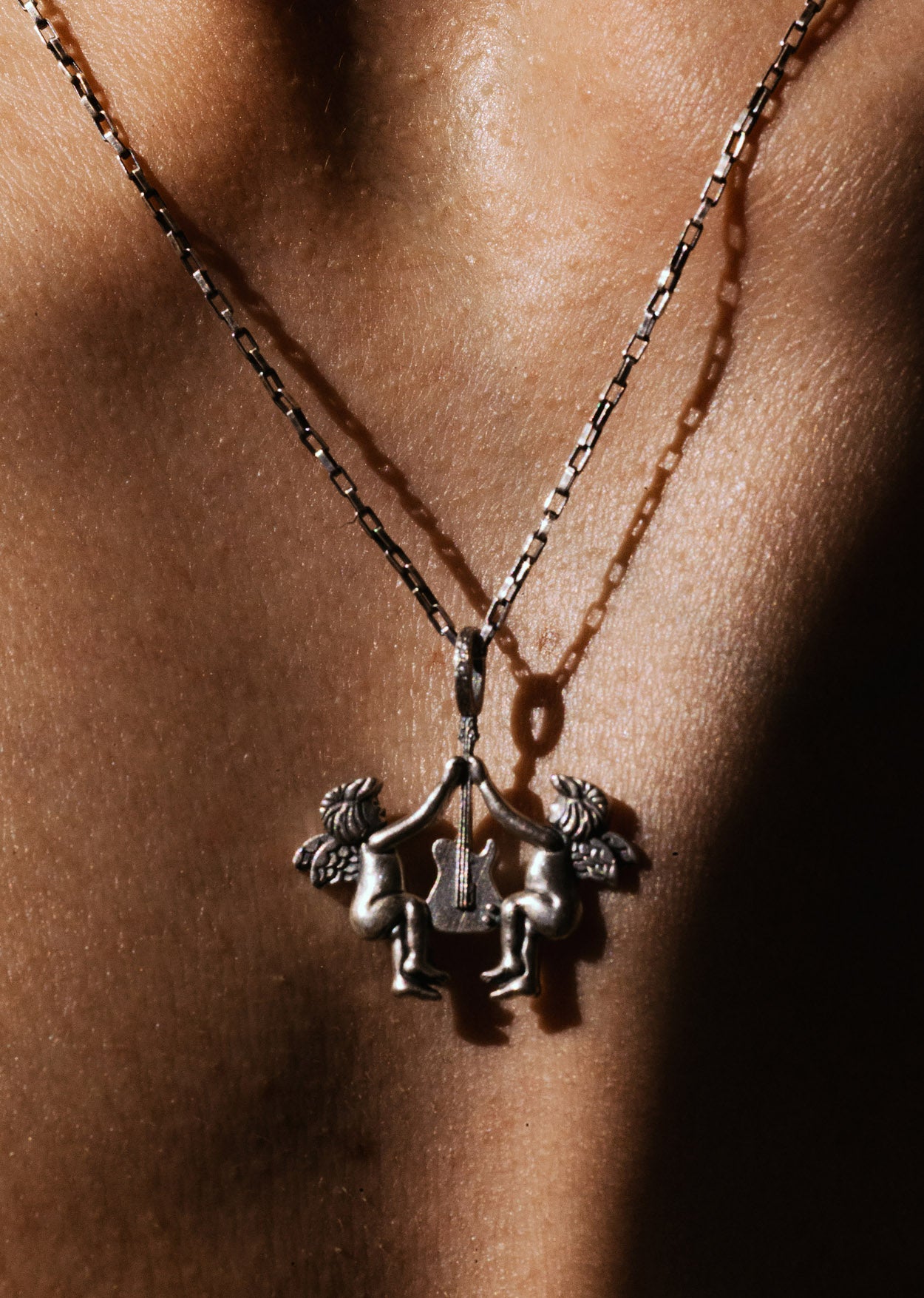 A powerful meeting point of music and symbolism, this necklace features a pendant with two sculpted cherubs supporting a central electric-guitar motif. The relief design is finished with an oxidised, aged silver finish that enhances the depth and character of the sculpture. The pendant is suspended from a sharp, chunky chain. Crafted from solid 925 sterling silver, engraved with the PHIX logo, and handcrafted in India, this piece is a modern relic with timeless attitude.