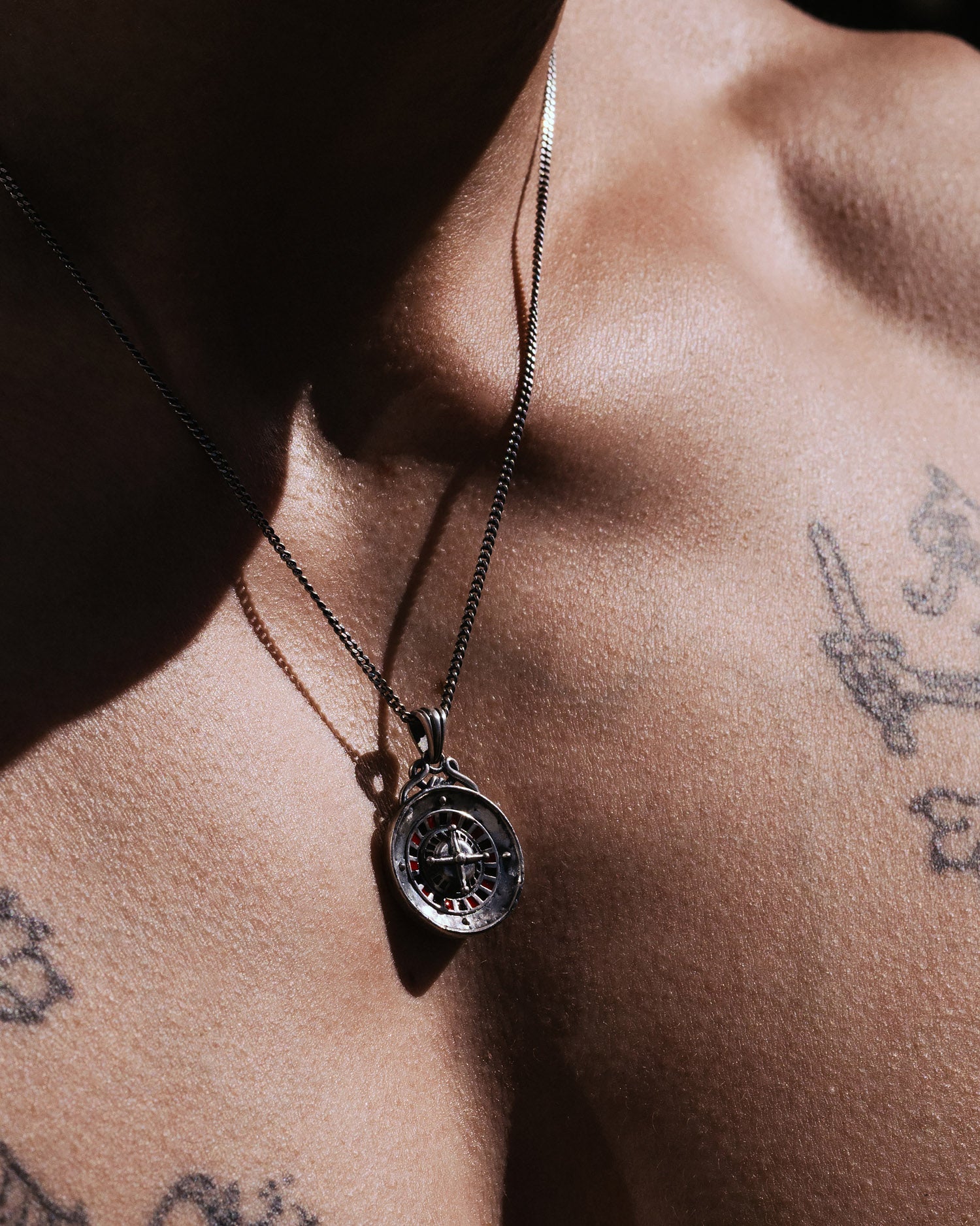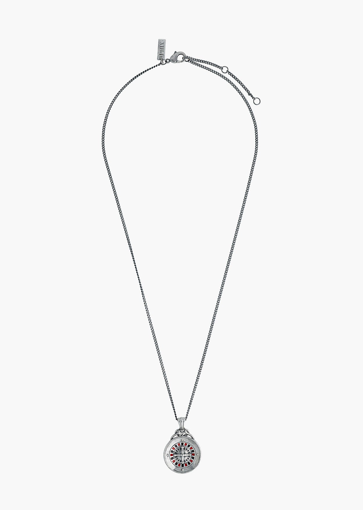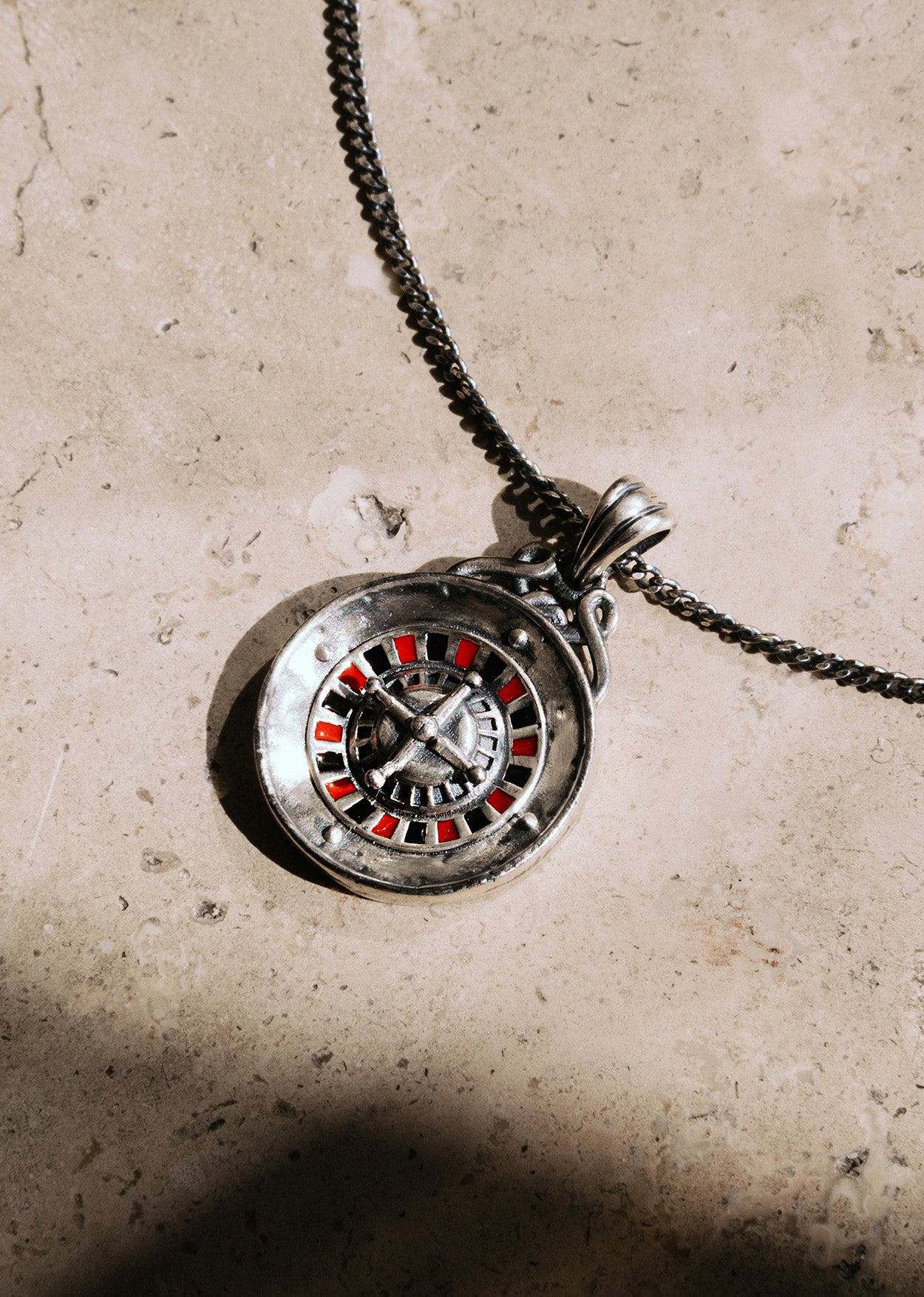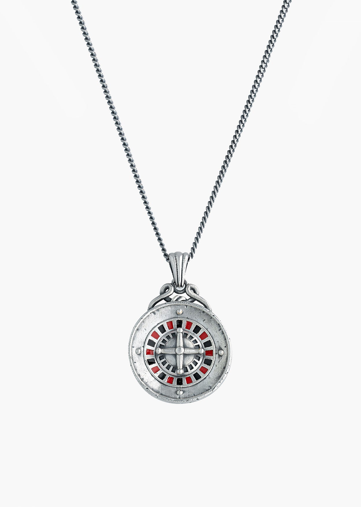 A bold symbol of chance and rebellion, this necklace showcases a detailed roulette wheel set within a circular pendant. The medallion is finished with an oxidised patina that provides a contrast to the vibrant red and black enamel detailing of the wheel. Suspended from a complementing chain, the piece is handcrafted from silver-plated brass in India.