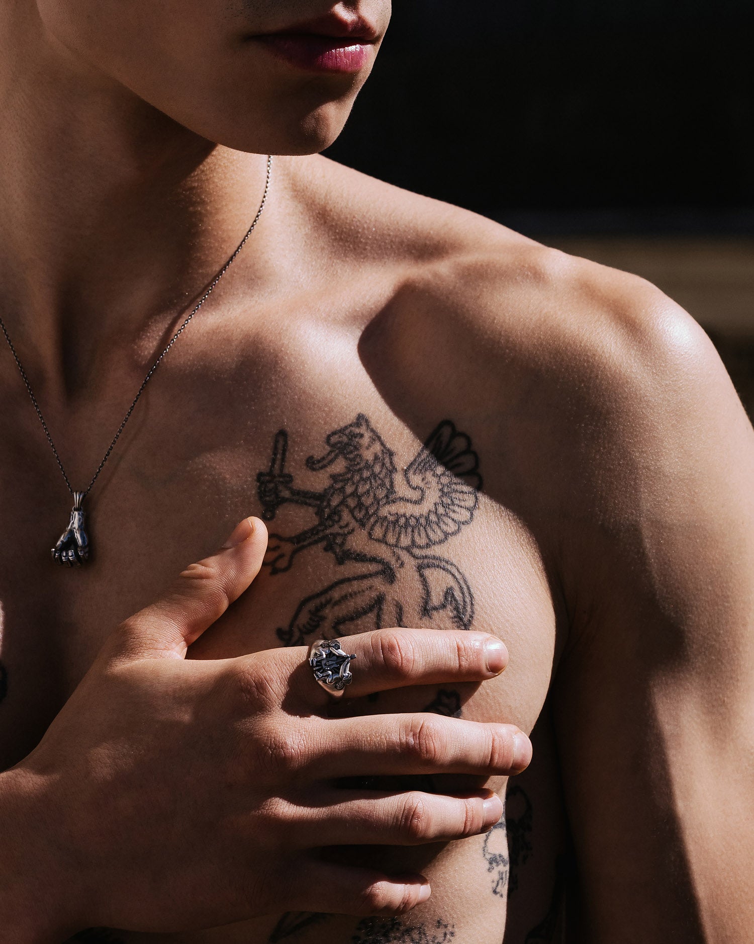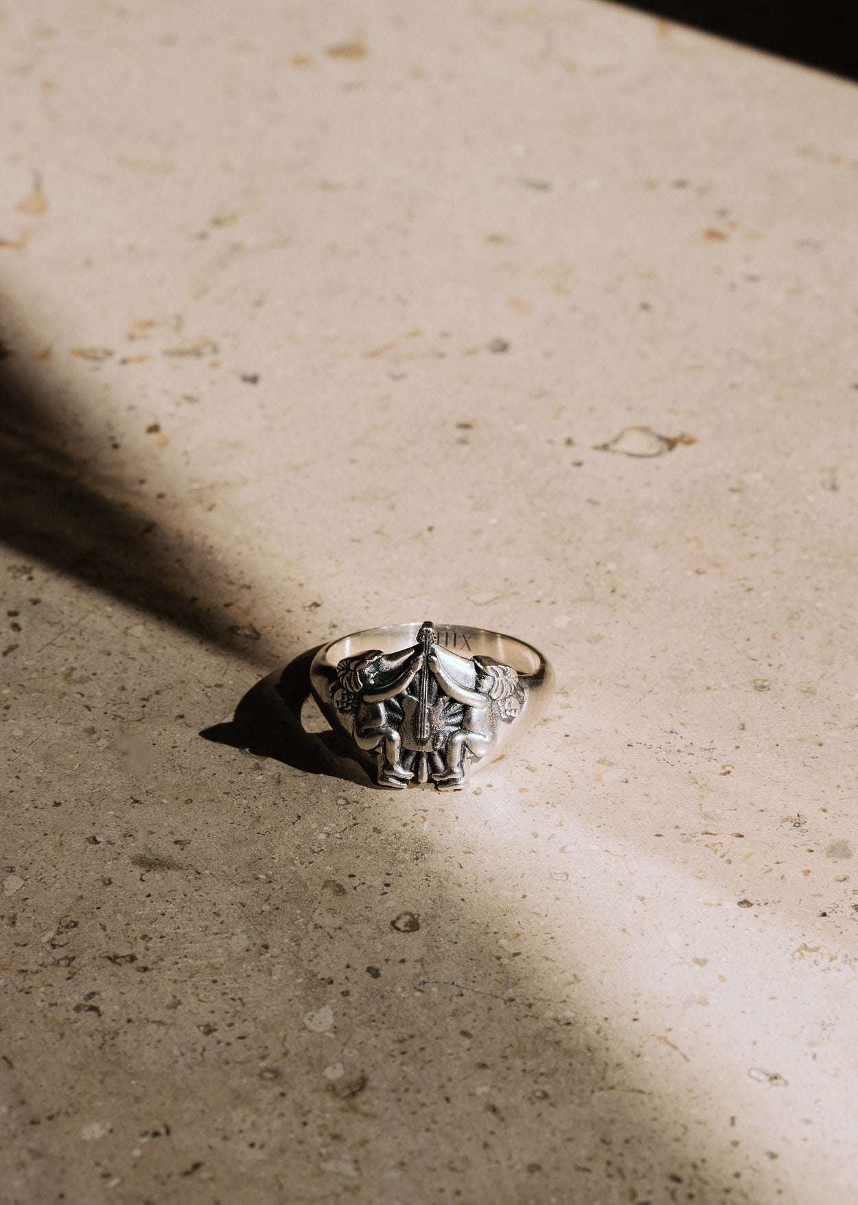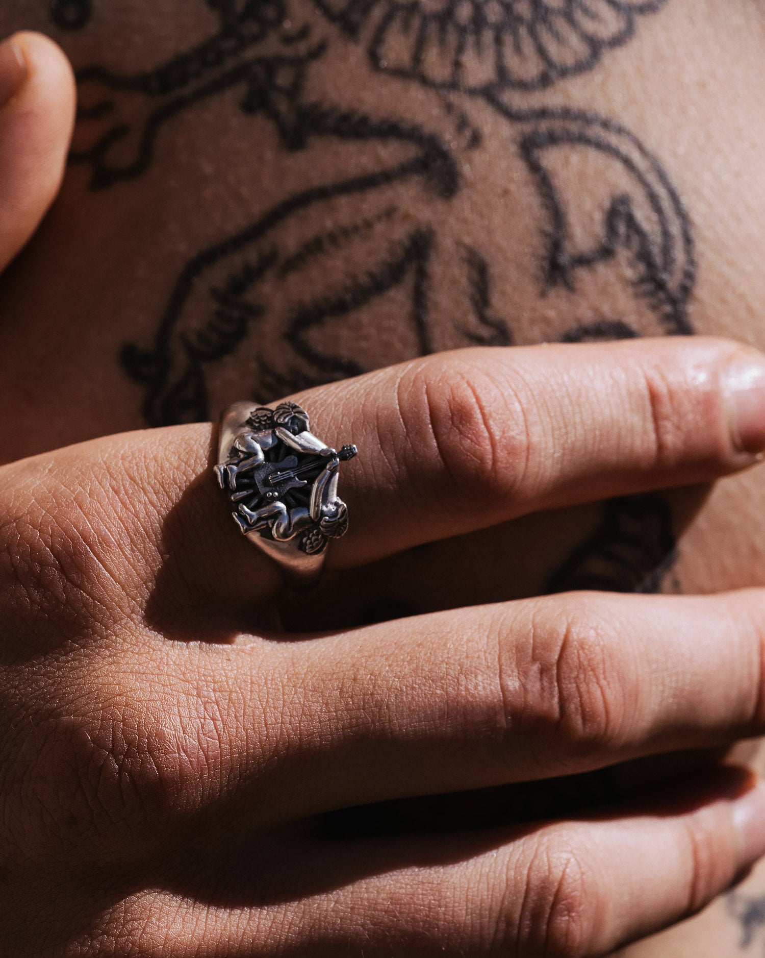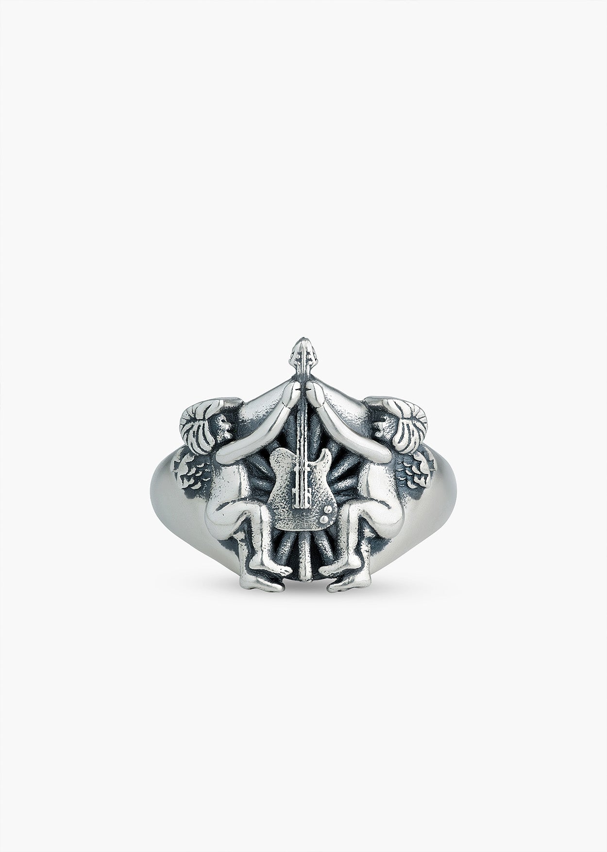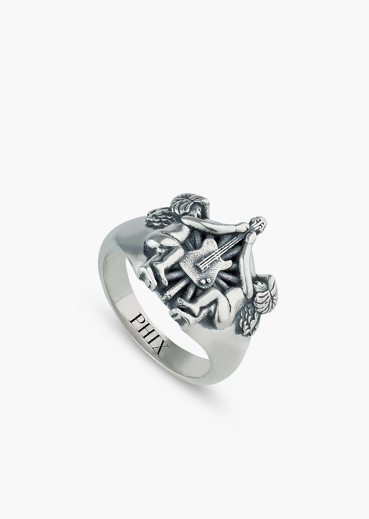 Two sculpted cherubs kneel on either side of a raised electric-guitar motif, cast in solid 925 sterling silver. Finished with an oxidised, aged silver finish that enhances the depth and character of the design. Engraved with the PHIX logo and handcrafted in India, this ring captures the meeting point of music and symbolism, a modern relic with timeless attitude.