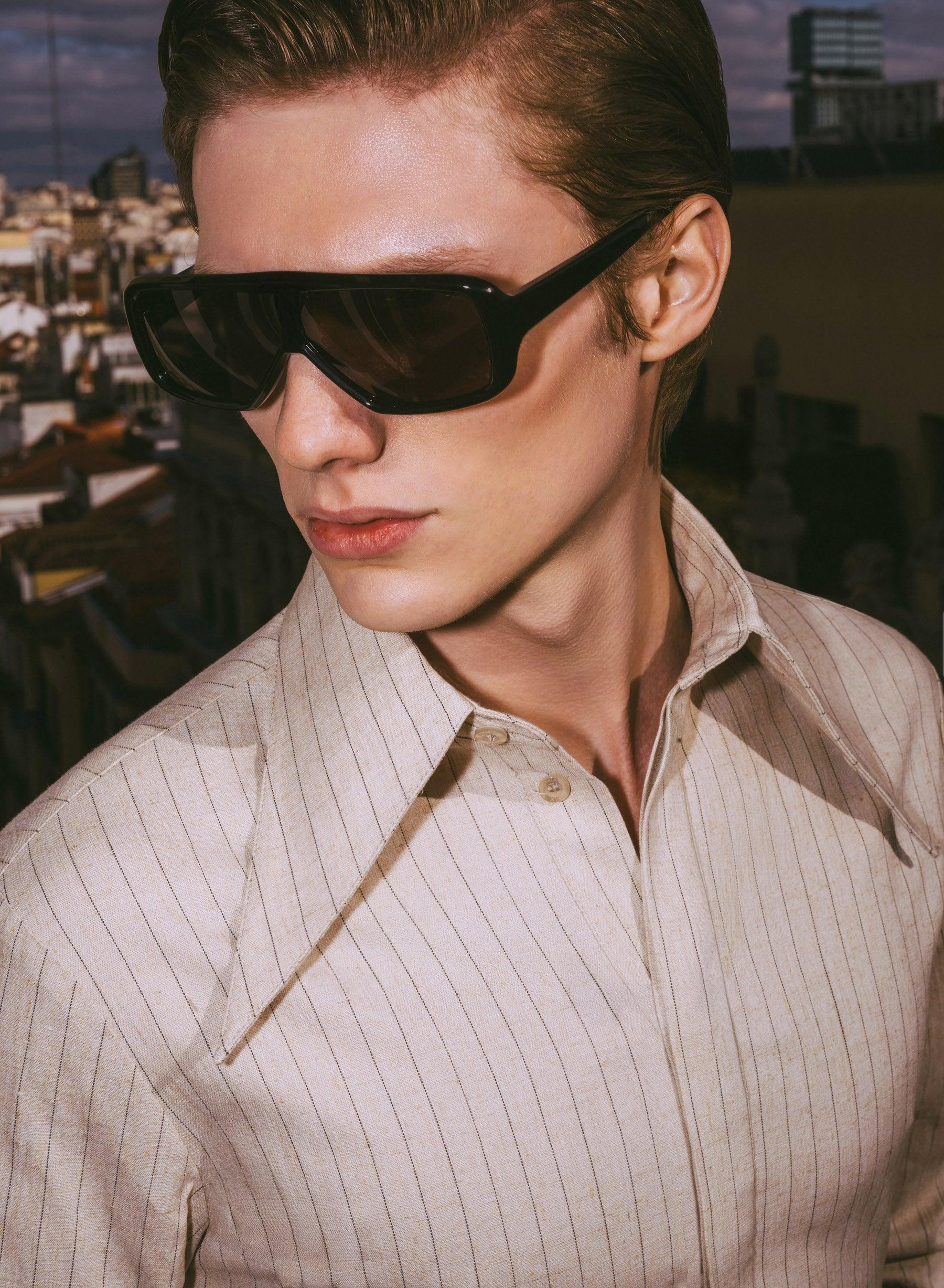 A refined take on warm-weather tailoring. Crafted from lightweight pure linen with a fine vertical pinstripe, this shirt balances breathability with structure, keeping the silhouette clean and precise. The exaggerated dagger collar defines the neckline and gives the piece its edge, while the slim cut through the body maintains a sharp, intentional line.