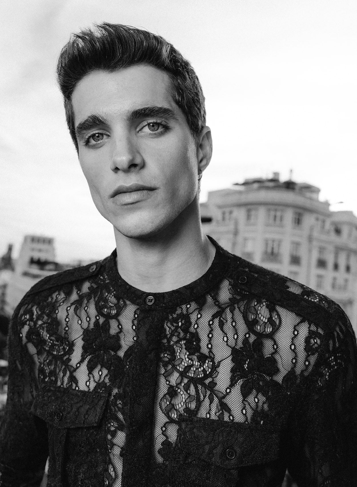 Our latest black lace floral shirt blends delicate craftsmanship with contemporary design. This semi-sheer piece features a vintage-inspired grandad collar, buttoned cuffs and two functional chest flap pockets. Adorned with our elegant monogram buttons and tailored into a sleek, slim fit silhouette, this is a true statement piece.