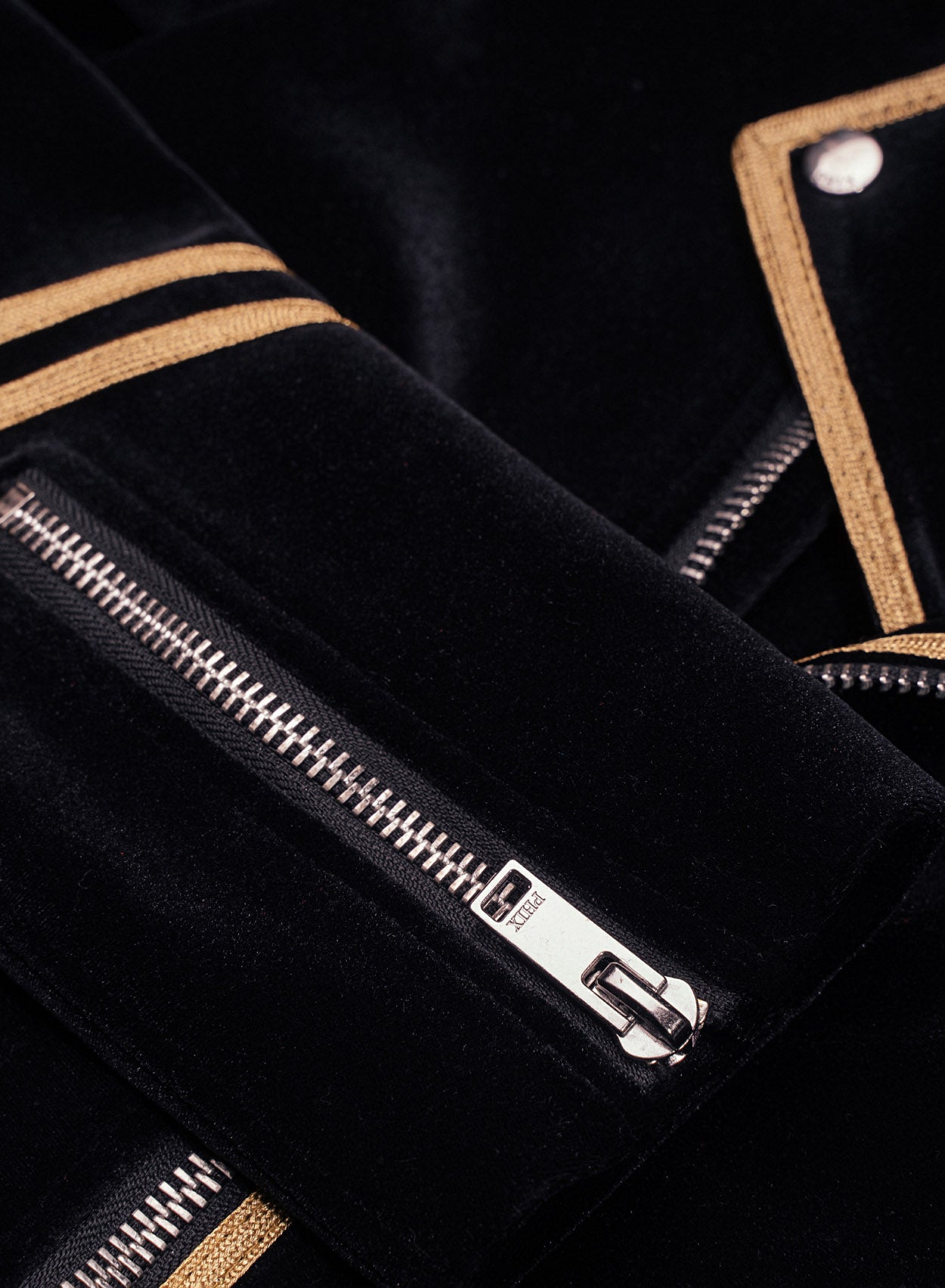 A bold new hybrid of the classic biker silhouette paired with the hallmarks of military style, this jacket is crafted from plush black velvet and is finished with gold trims throughout. Featuring an asymmetric zipper, slit waist pockets and silver tone hardware. This piece is fully lined for easy wear. Also available in red.