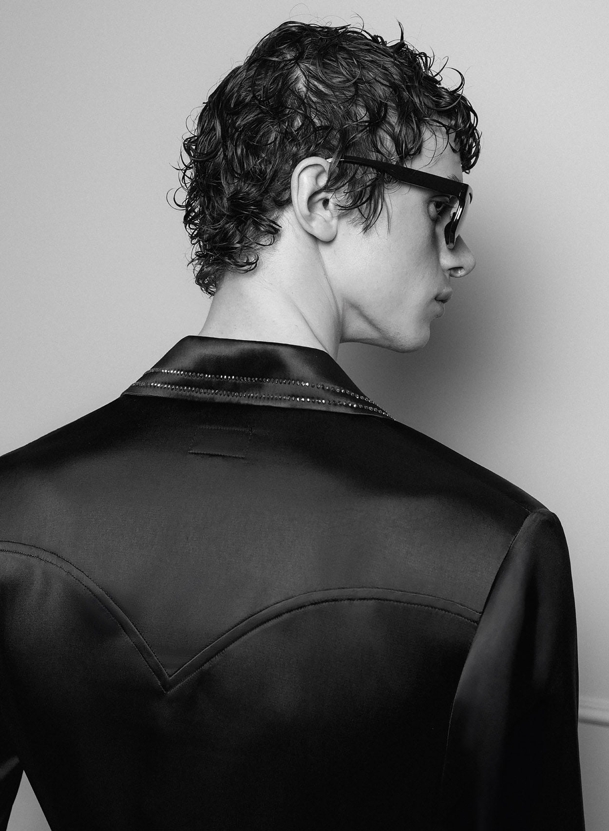 Rhinestone embellishments trace the lapels of this black satin shirt, creating a bold focal point that enhances the double-breasted design. Tailored for a slim fit, it features notched lapels and fitted cuffs, offering a sleek, refined finish to the structured silhouette.