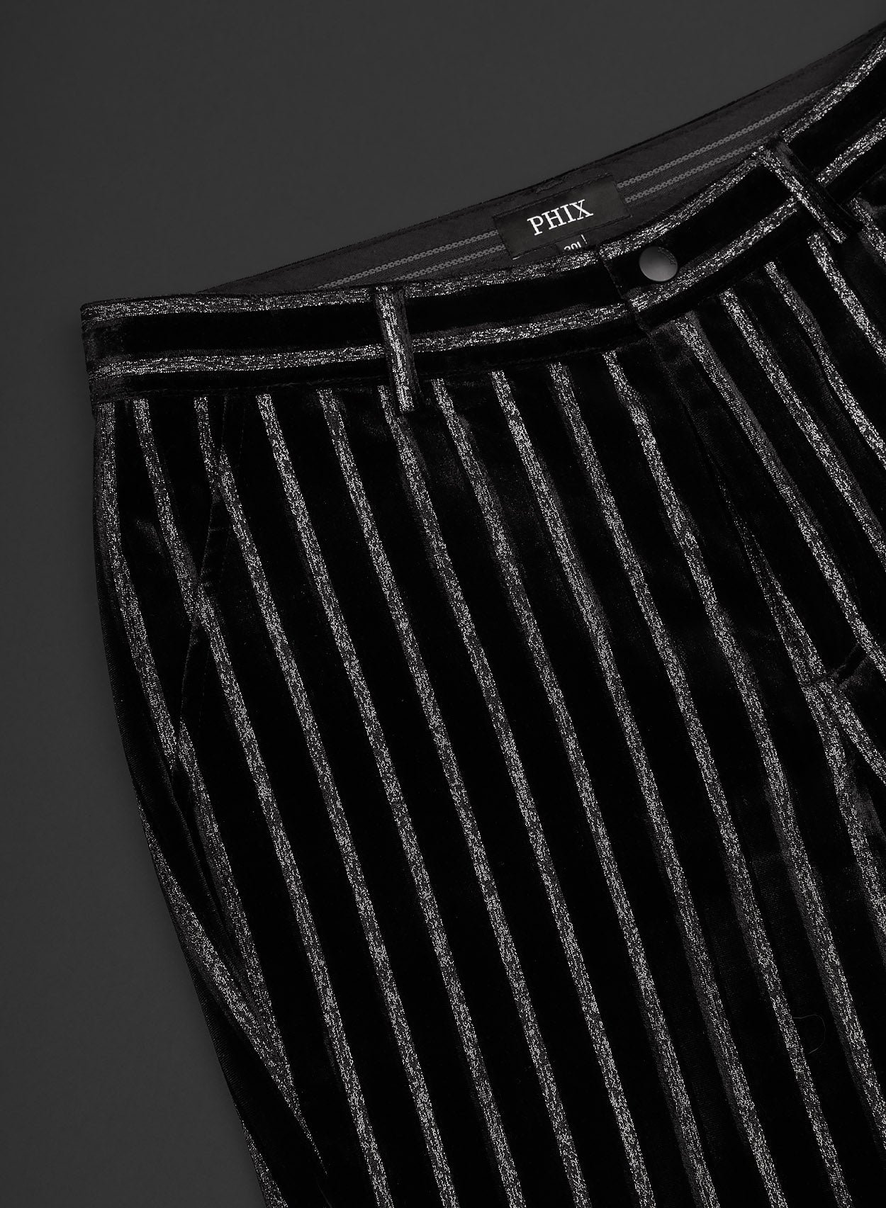 Crafted from luxurious black velvet, these flare trousers feature vertical shimmer accents that enhance the sleek, refined design. With a tailored fit through the waist and hips, they gently flare for a flattering silhouette that balances sophistication with comfort.