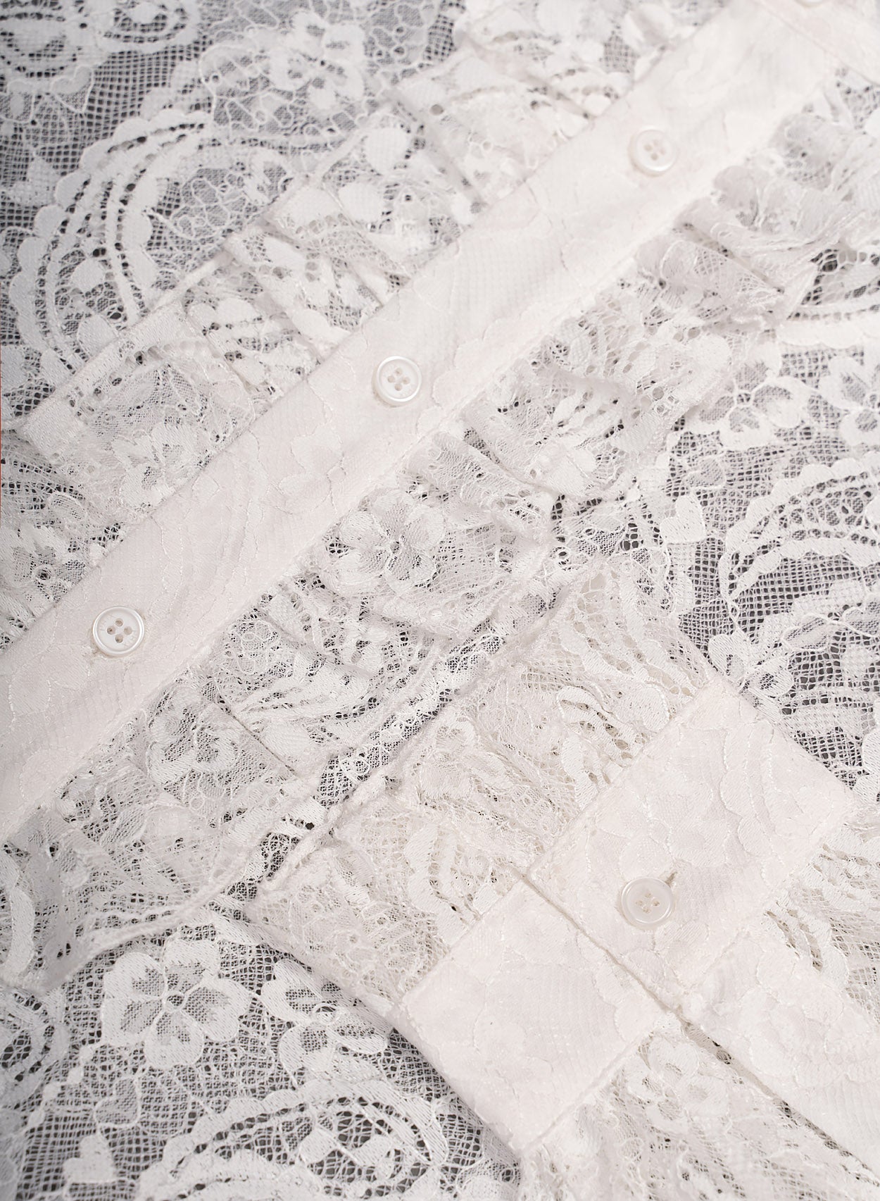 Channel timeless elegance with the White Lace Paisley Ruffle Shirt, a delicate blend of vintage charm and modern sophistication. Crafted from intricate paisley lace, this shirt features romantic ruffle detailing along the chest, adding movement and feminine flair. The semi-sheer design provides a hint of allure, making it perfect for layering or wearing on its own for a bold statement. With its tailored fit and vintage-style grandad collar, this shirt exudes grace and versatility, making it a standout piece for both casual and formal occasions.