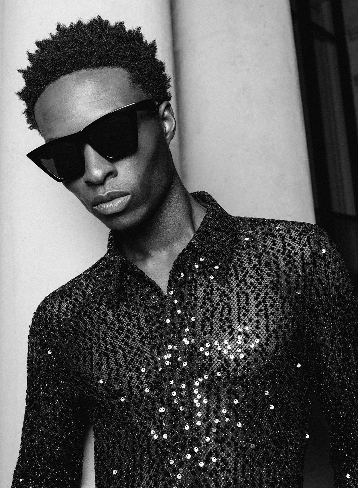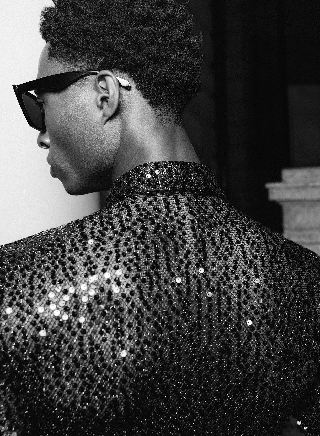 - Fully covered in black sequins for a striking, high-shine finish