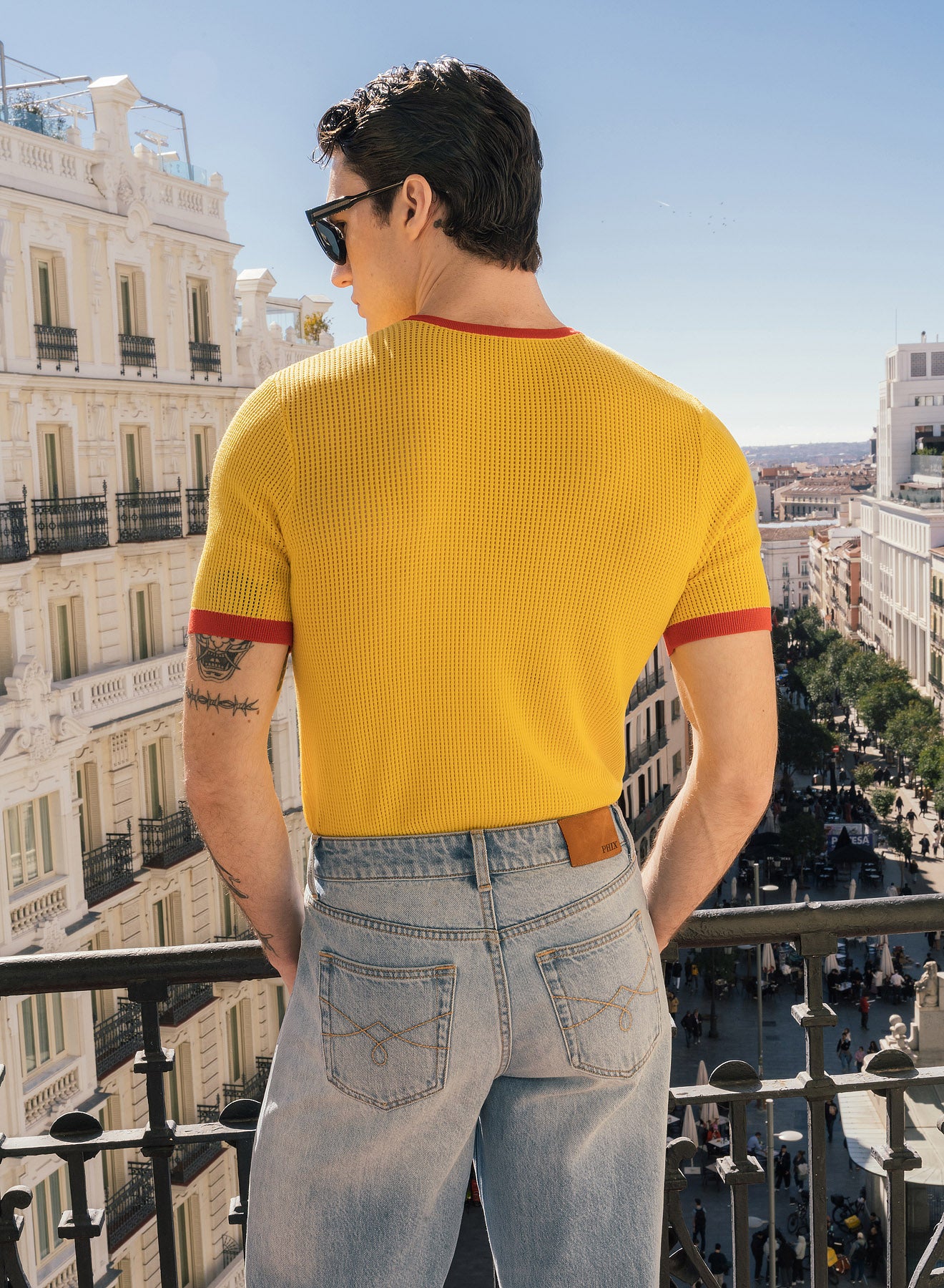 Crafted from a soft mesh fabric, the T-shirt is cut to a slim fit, designed to sit cleanly on the body. A versatile piece that works both as a standalone statement and layered into everyday looks.