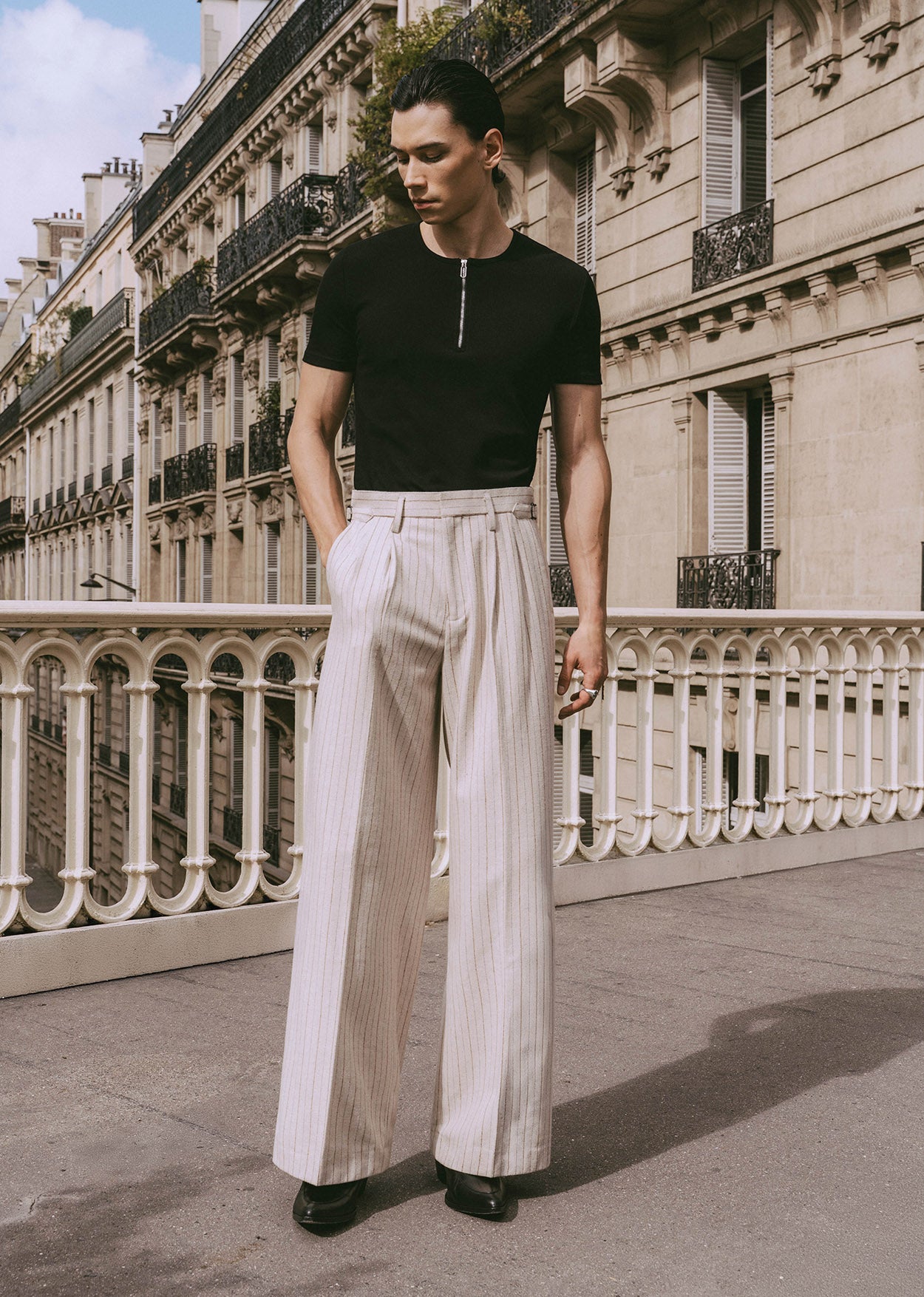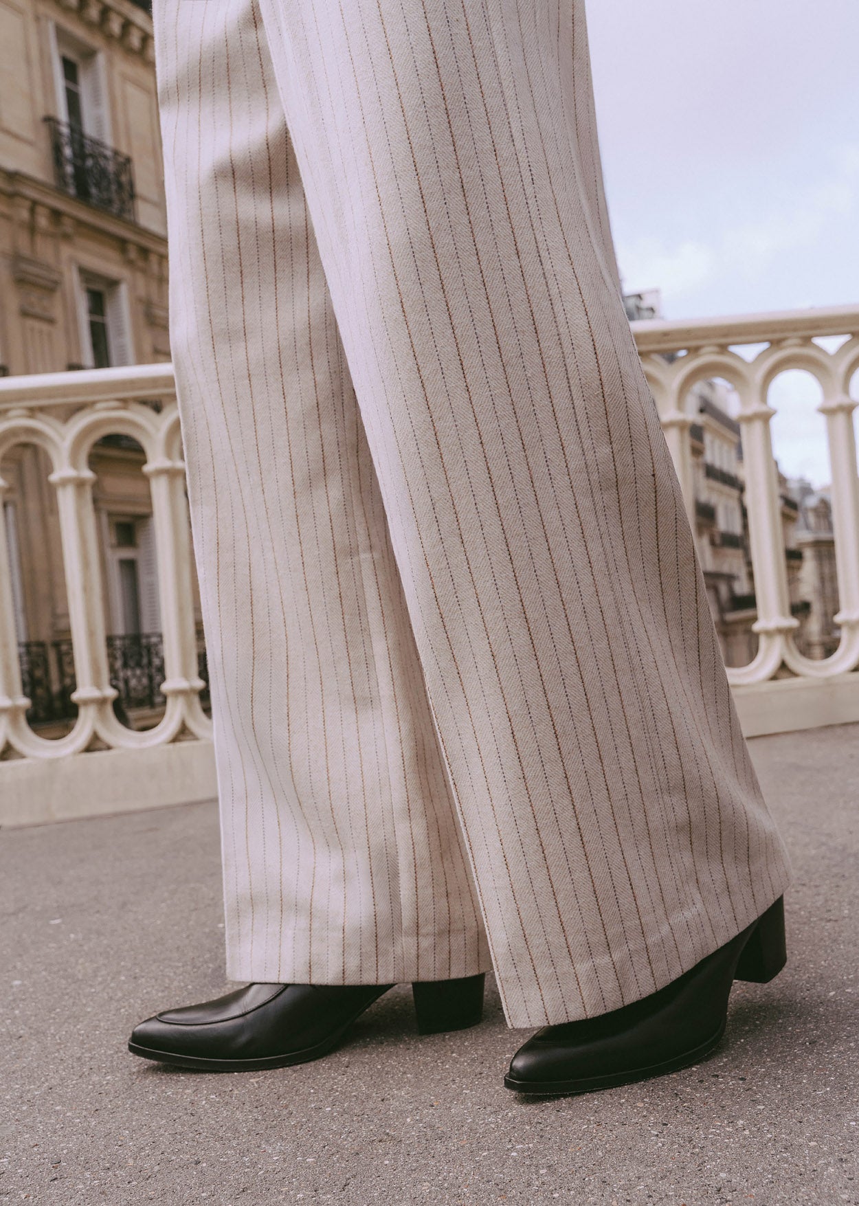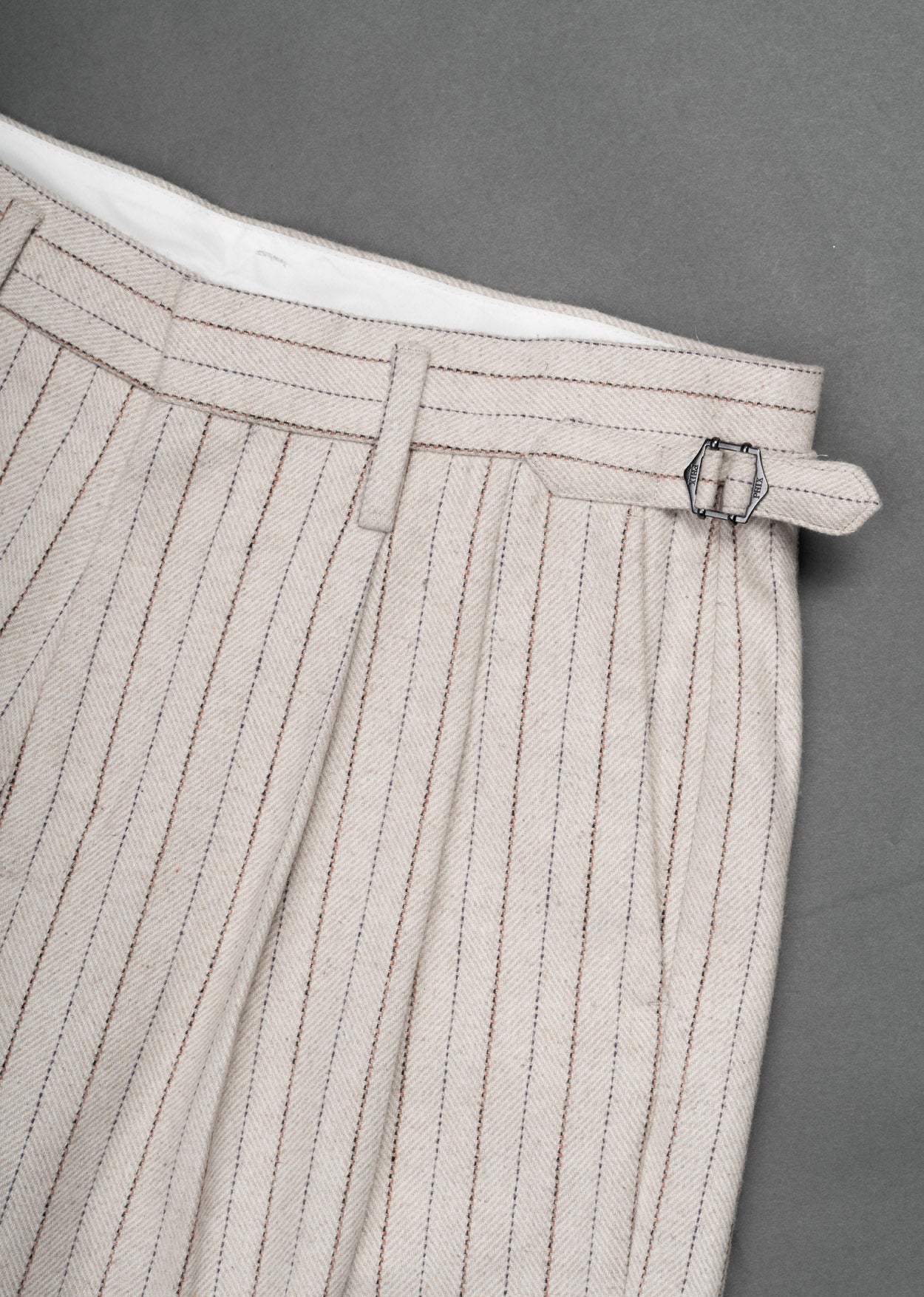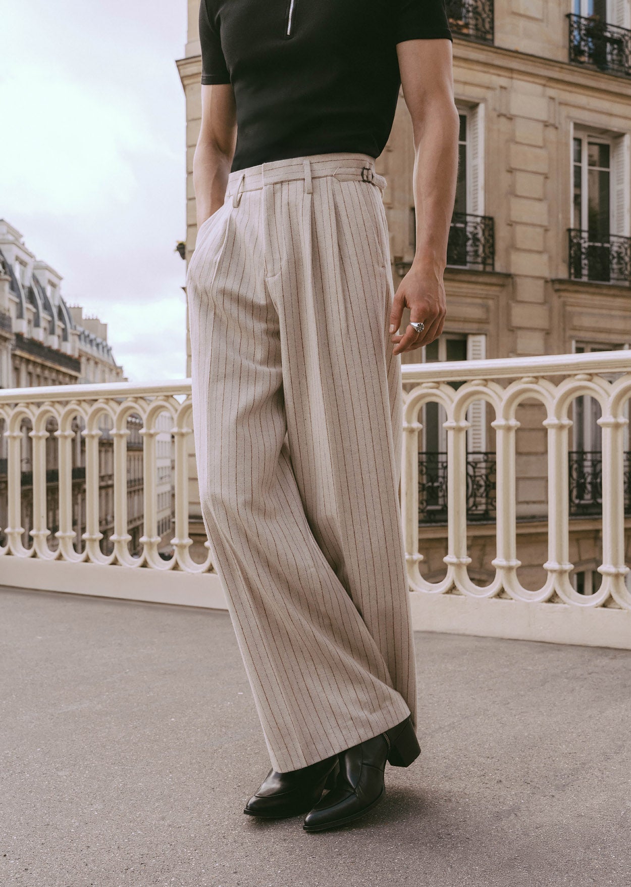A classic silhouette, redefined by a definitive fabric. These high-waisted, wide-leg trousers are crafted from a luxurious Wool Flannel in Pinstripe Herringbone, creating a rich texture and a refined presence. The adjustable side buckles and clean pleats ensure a tailored fit and a sophisticated drape, while the pinstripe and herringbone pattern lend the piece a timeless look. Also available in brown, metallic pin-stripe, off-white and black.