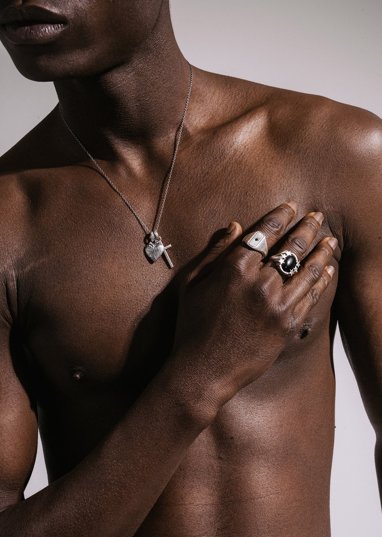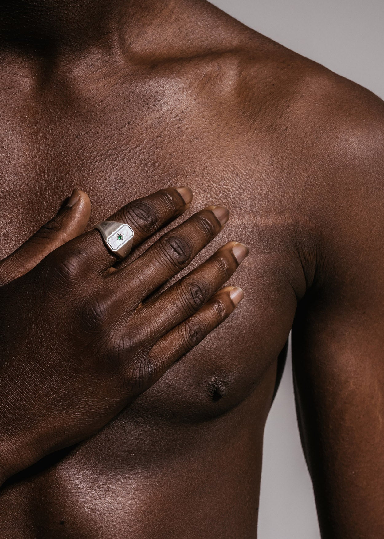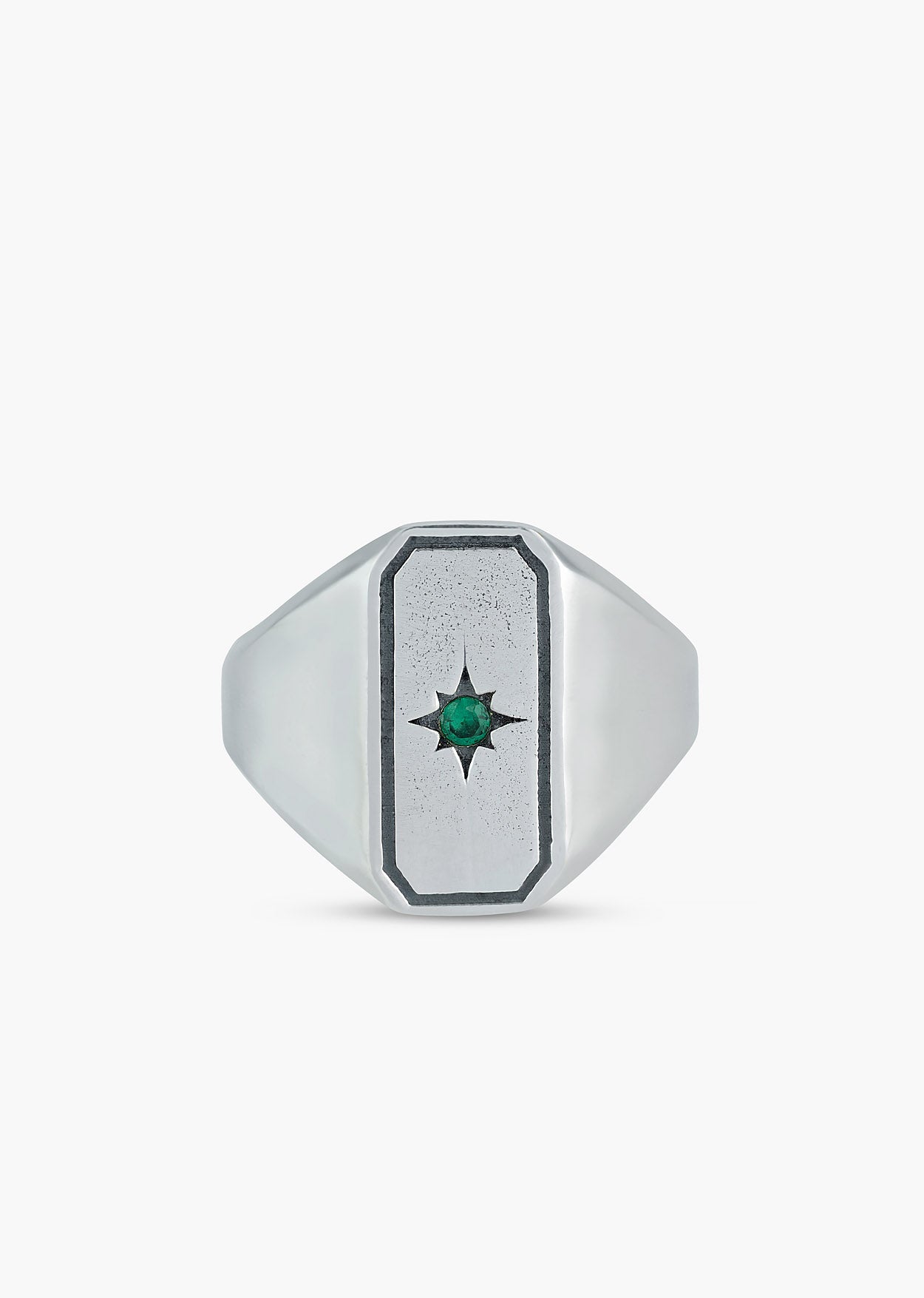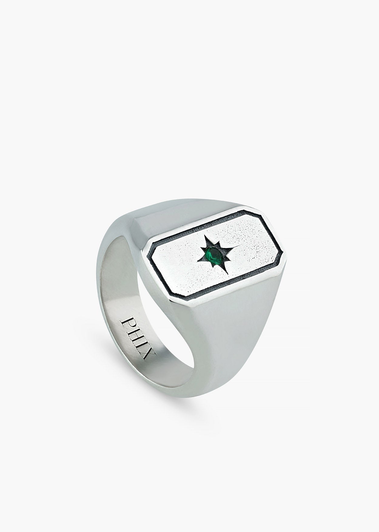 This signet ring features an octagonal silhouette and sharp, geometric lines. The face is defined by a textured central panel, anchored by a striking green emerald crystal starburst. Handcrafted from silver-plated brass in India and engraved with the PHIX logo.