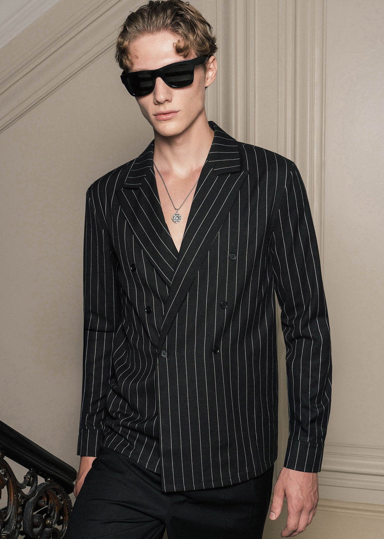 Modern pinstripe tailoring. This black double breasted pinstripe shirt offers a modern take on timeless tailoring. Crafted from a premium rayon blend fabric, it is designed for a sleek, slim fit and refined comfort, with a subtle hint of stretch.