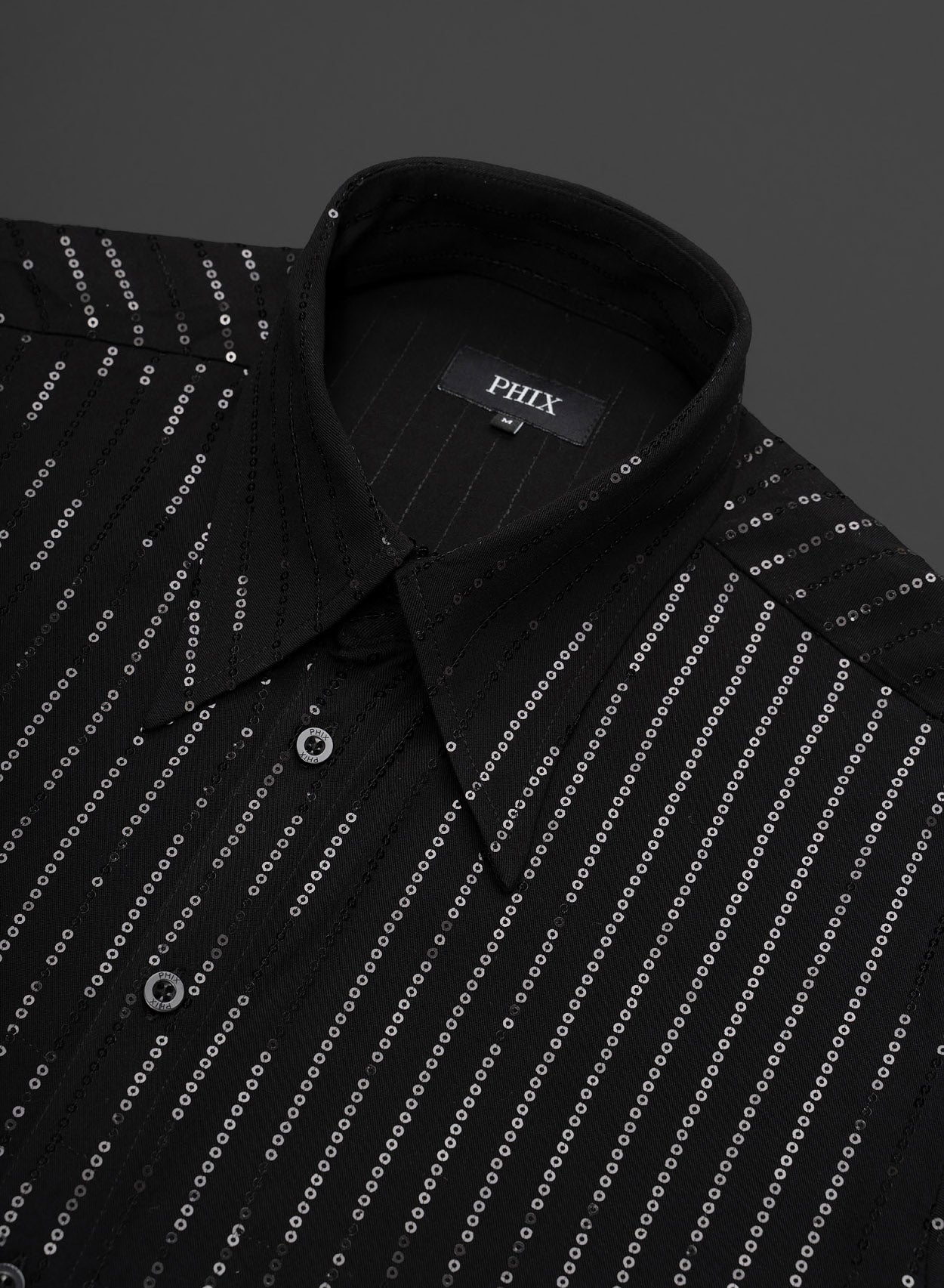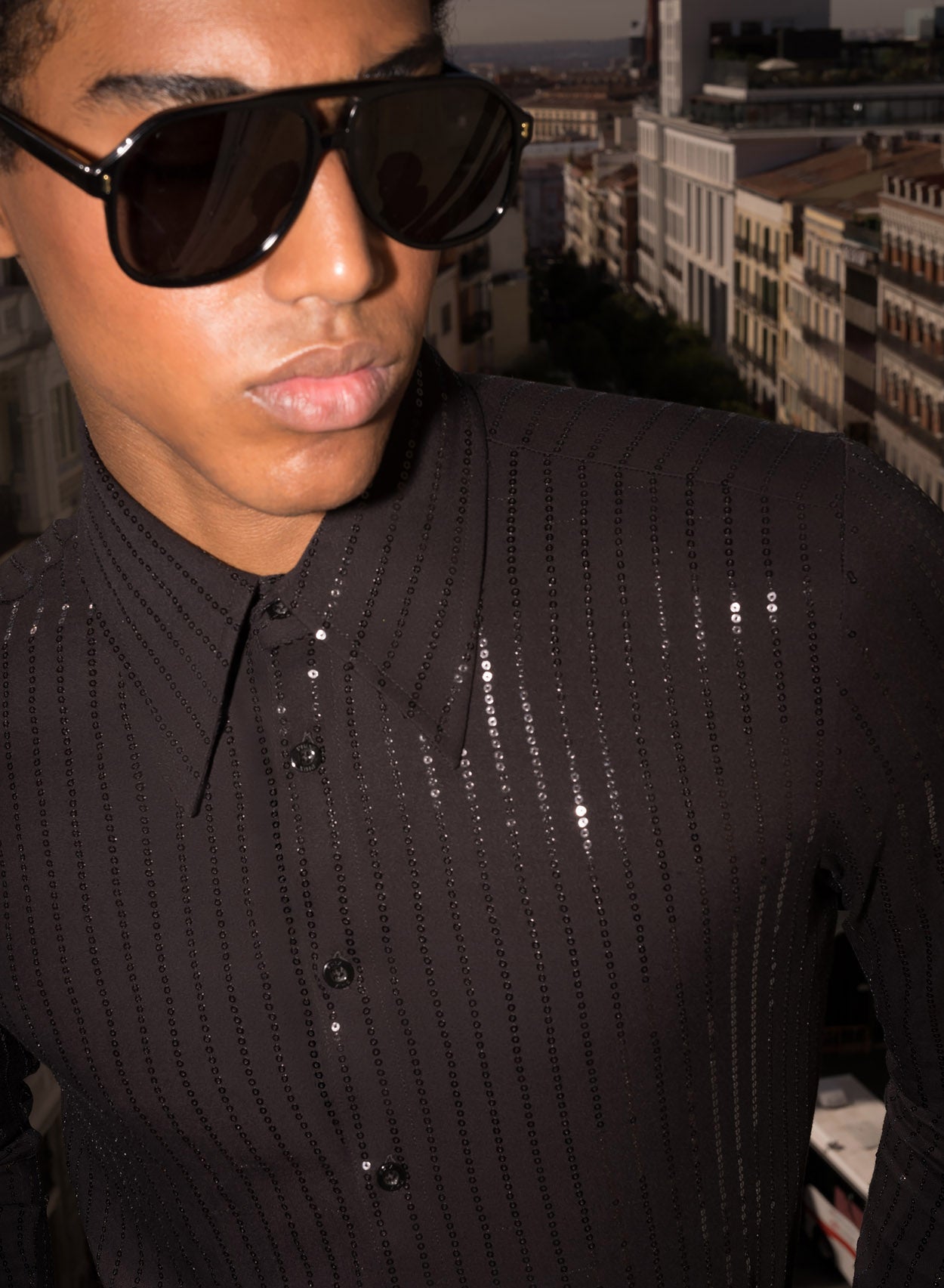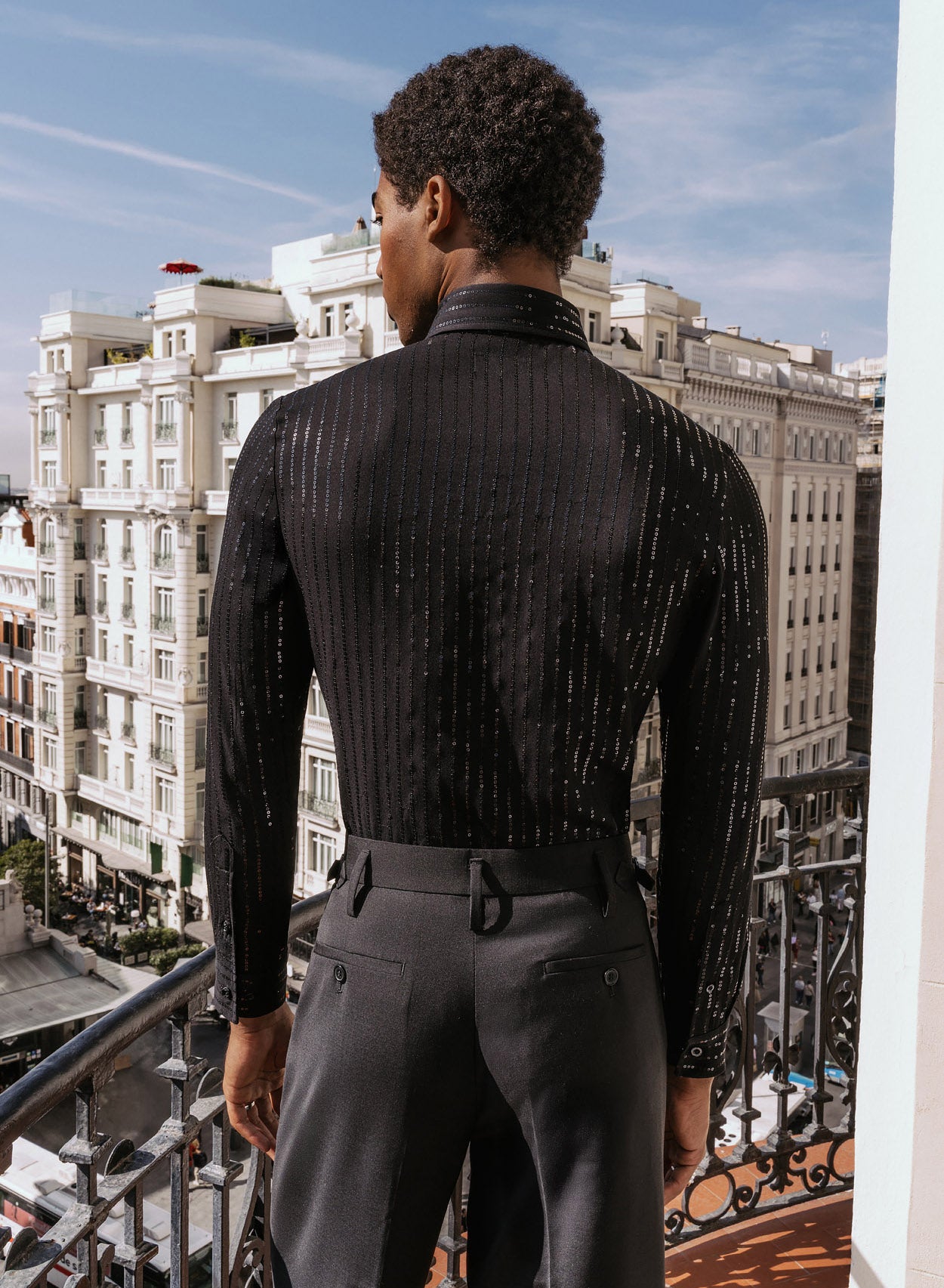 High-impact shine meets definitive drape. Crafted from a premium viscose fabric, the material provides a fluid drape and enhanced breathability. The shirt is defined by shimmering sequin pinstripes, creating a light-catching effect that moves with the purpose and fluidity of the viscose. Finished with a precise pointed collar and fitted cuffs, this piece delivers understated elegance with a high-impact twist.
