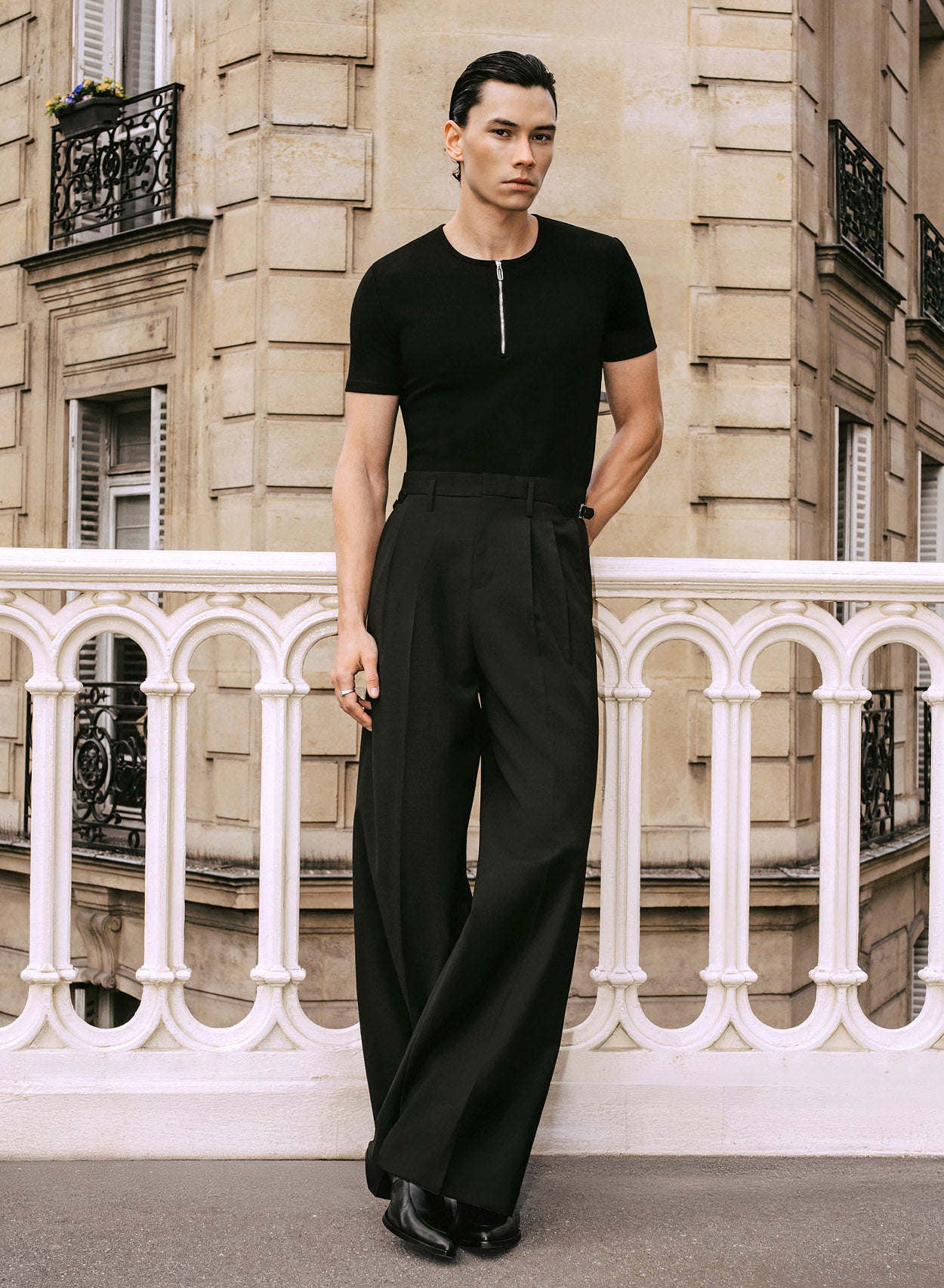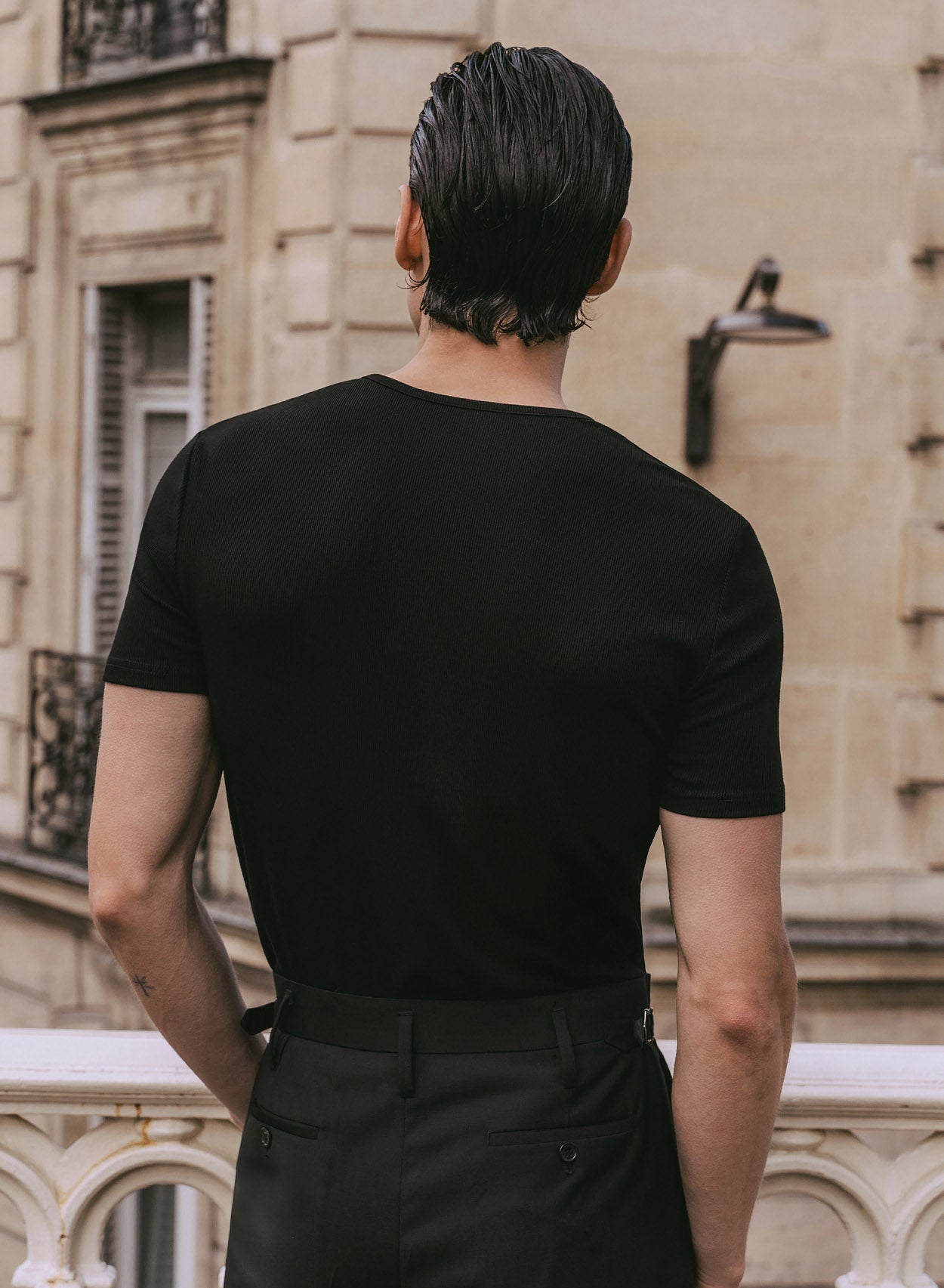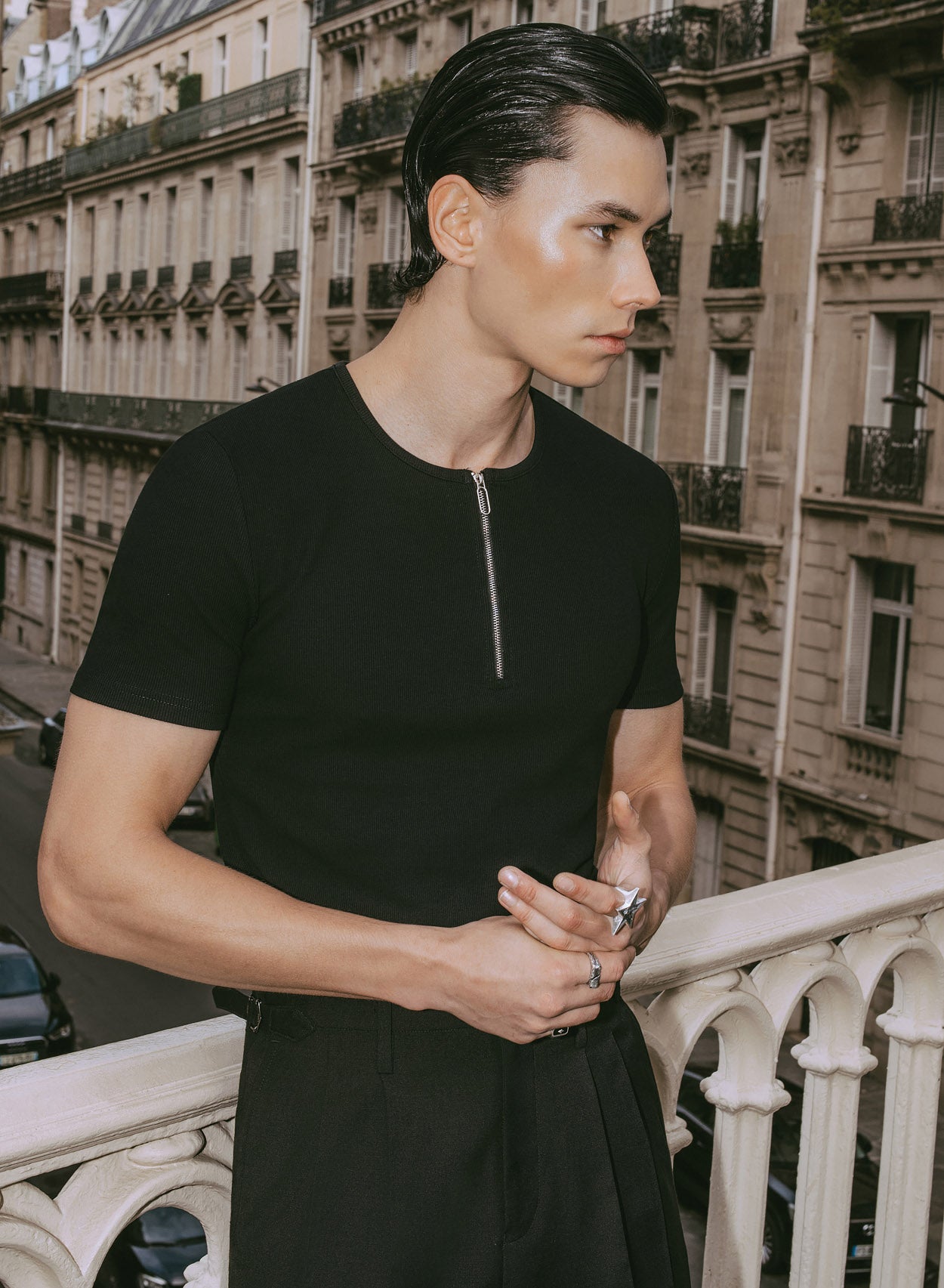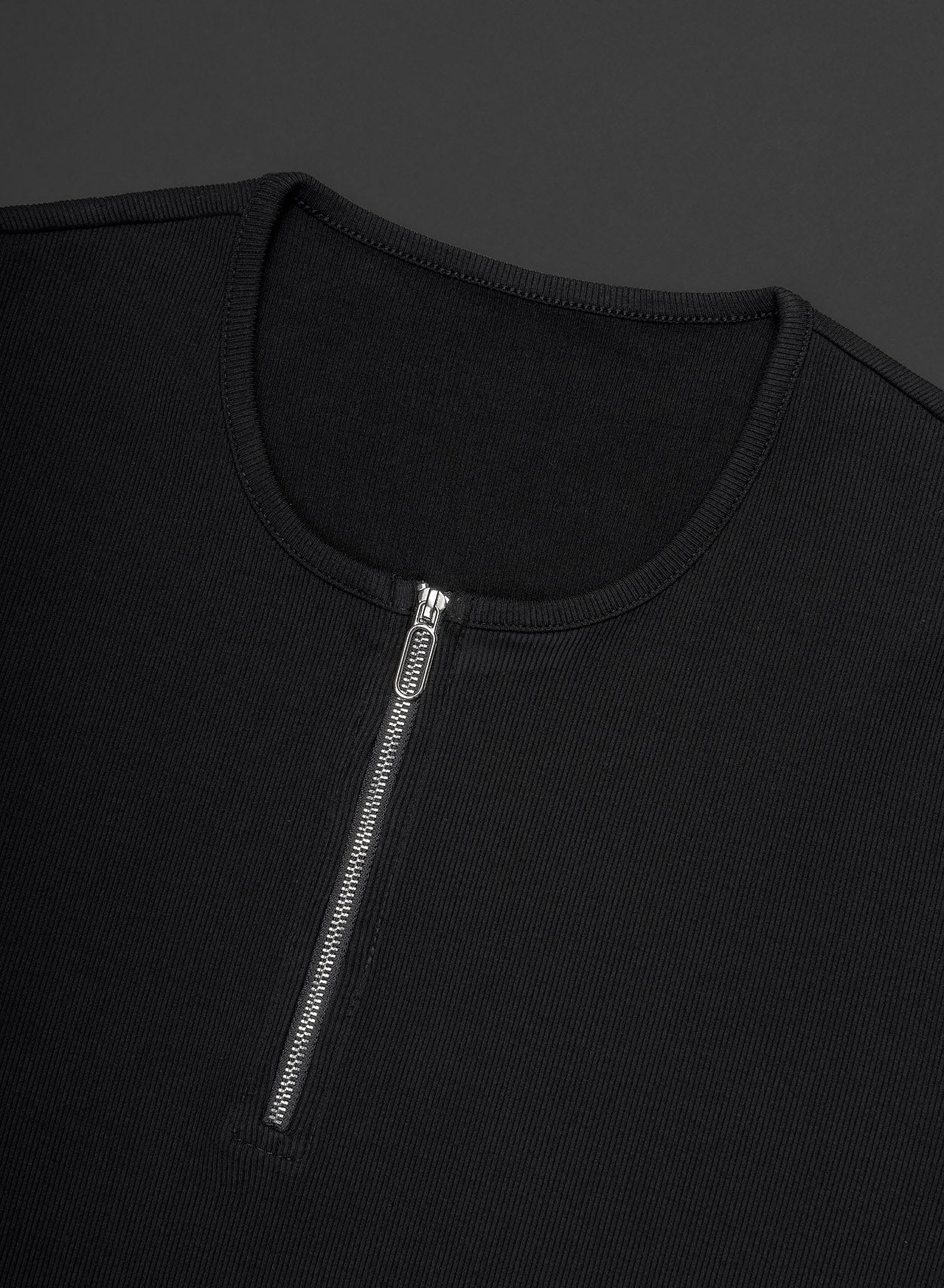 The ultimate basic has arrived. Our first collection of elevated basics begins with the Ribbed Zip Henley, redefining the wardrobe staple with a confident, uncompromising fit. The ribbed stretch material is designed to hug the body, providing a sleek silhouette, while the oval zip adds a unique 70s inspired detail.