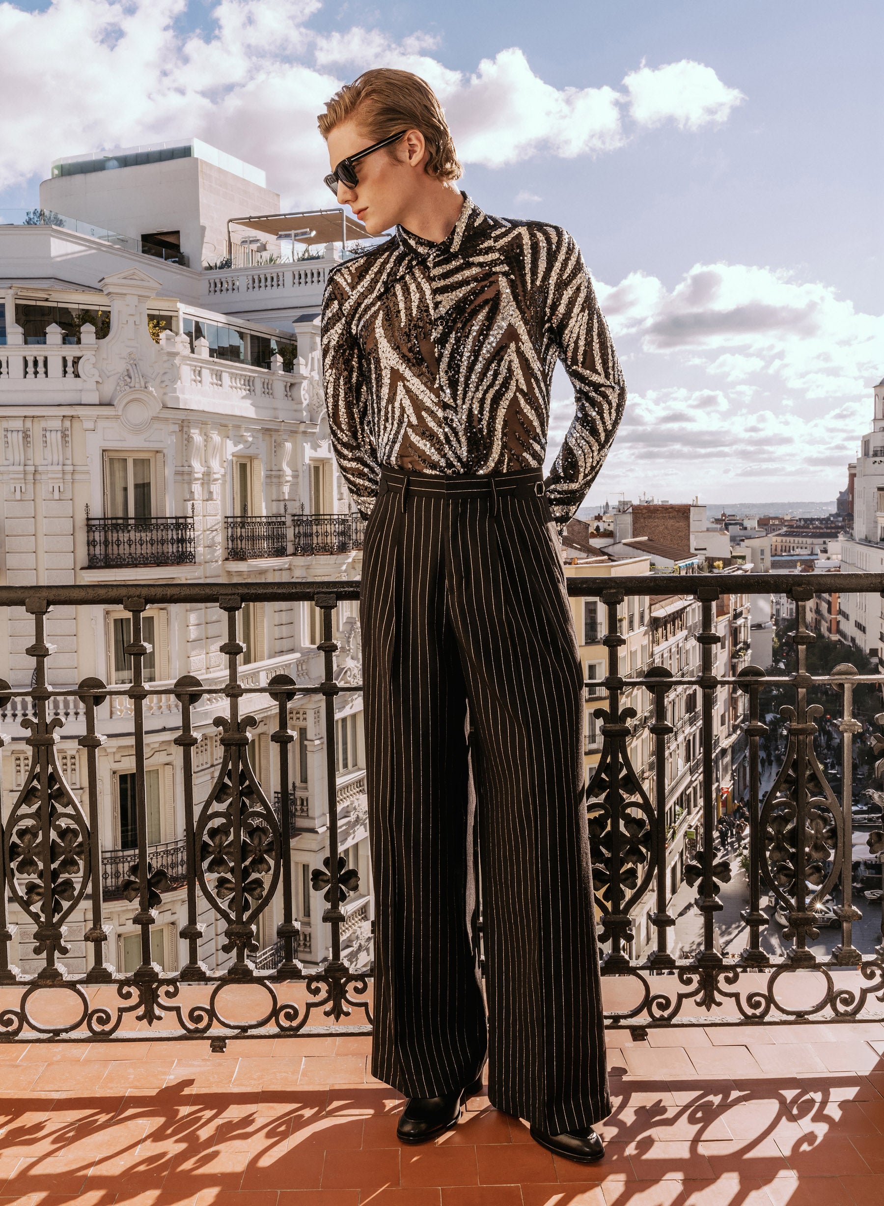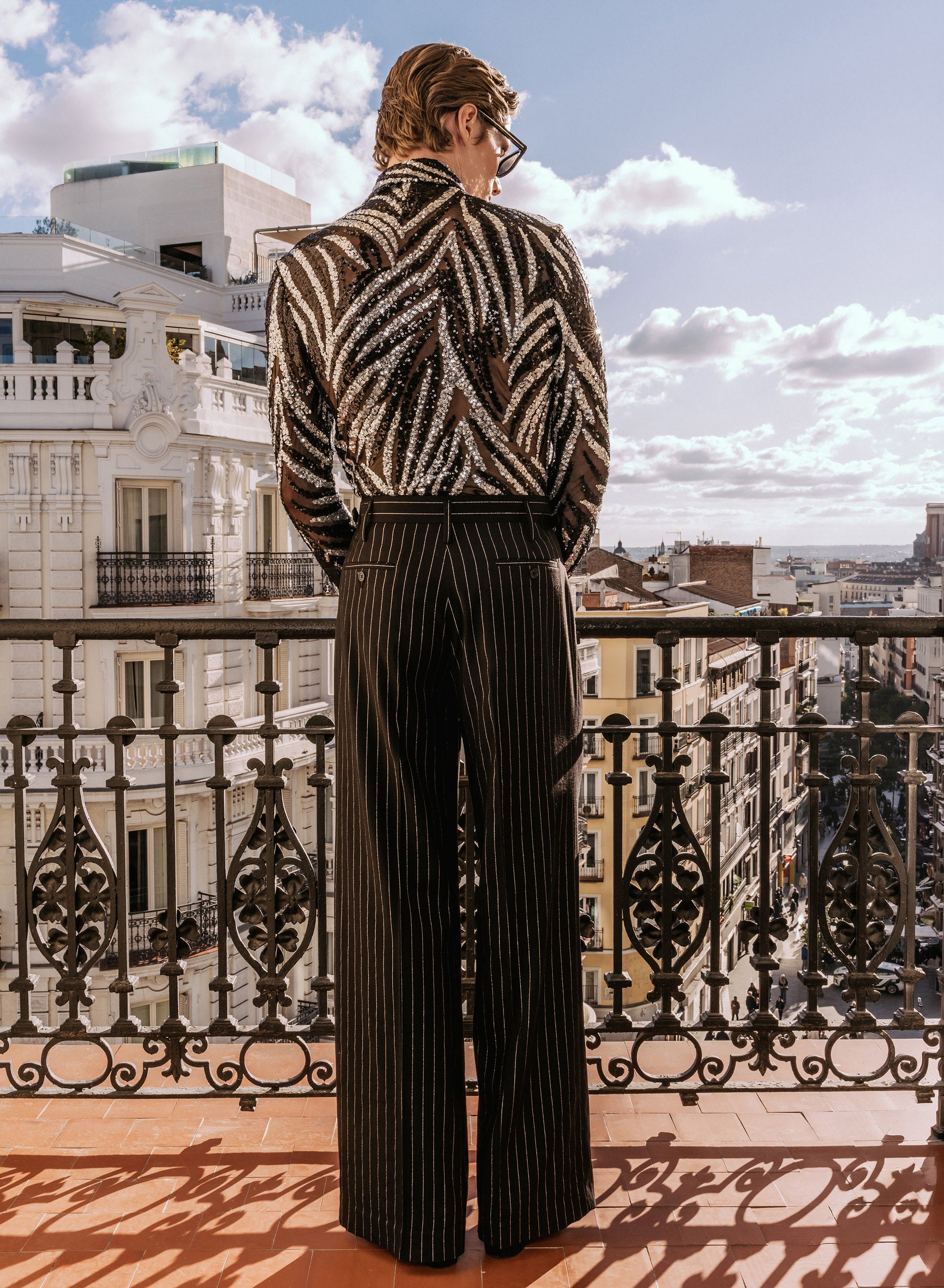 The classic pinstripe pattern is elevated by a metallic shimmer that runs through each individual stripe, adding a distinctive and confident touch. With a flattering high-waisted fit and adjustable side buckles, these trousers are a versatile choice for looks that naturally command attention. Also available in herringbone pin-stripe, brown, off-white and black.