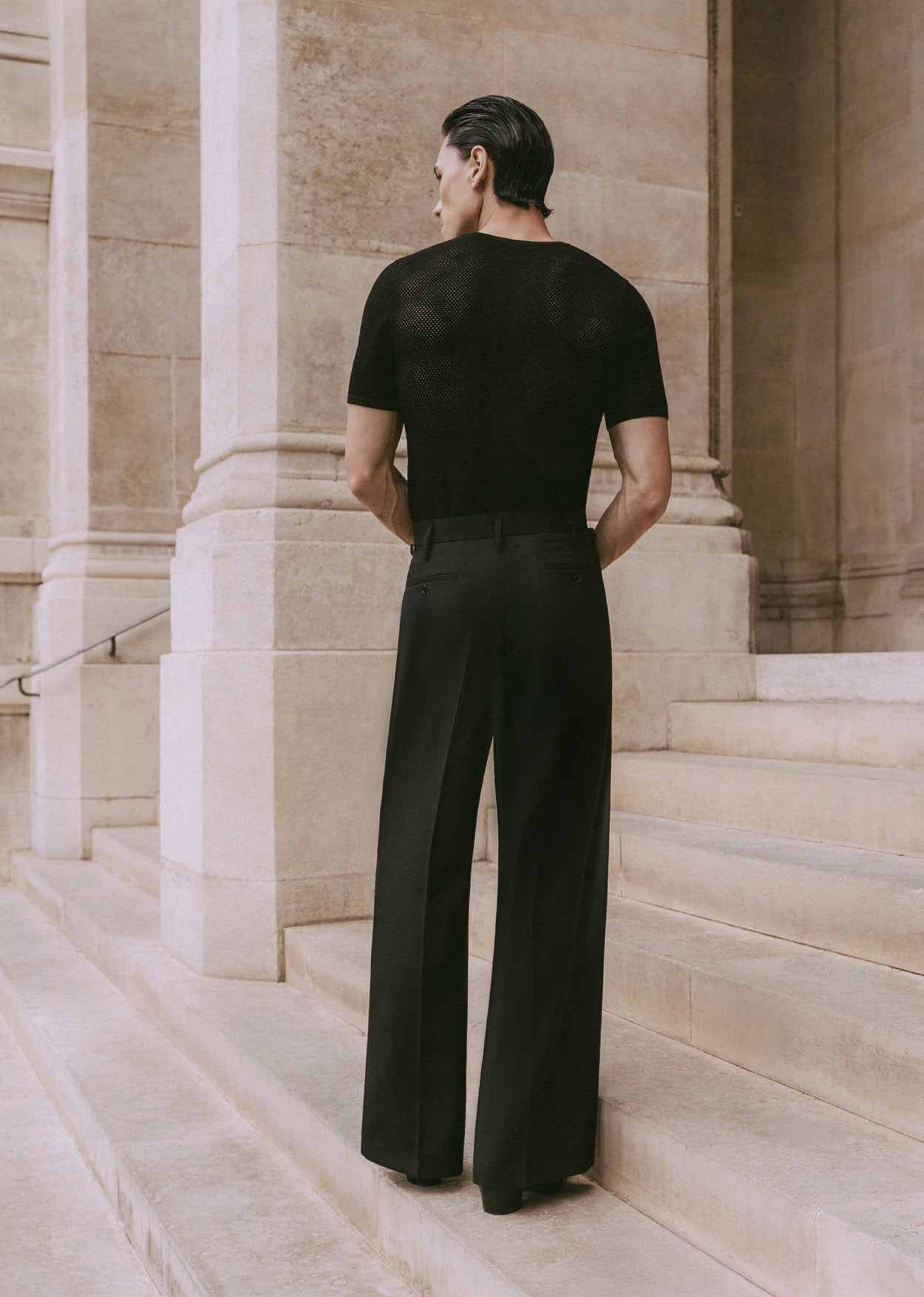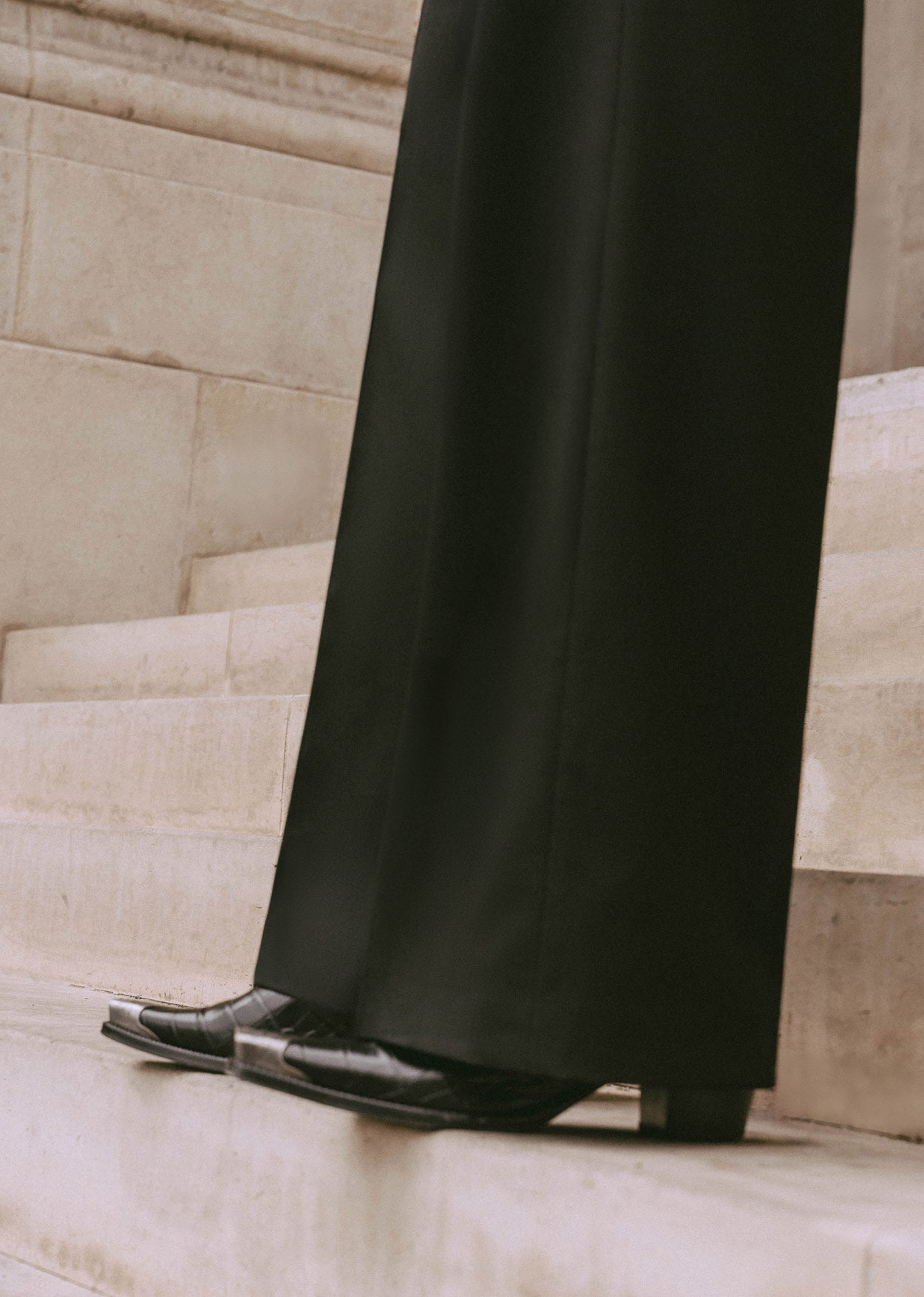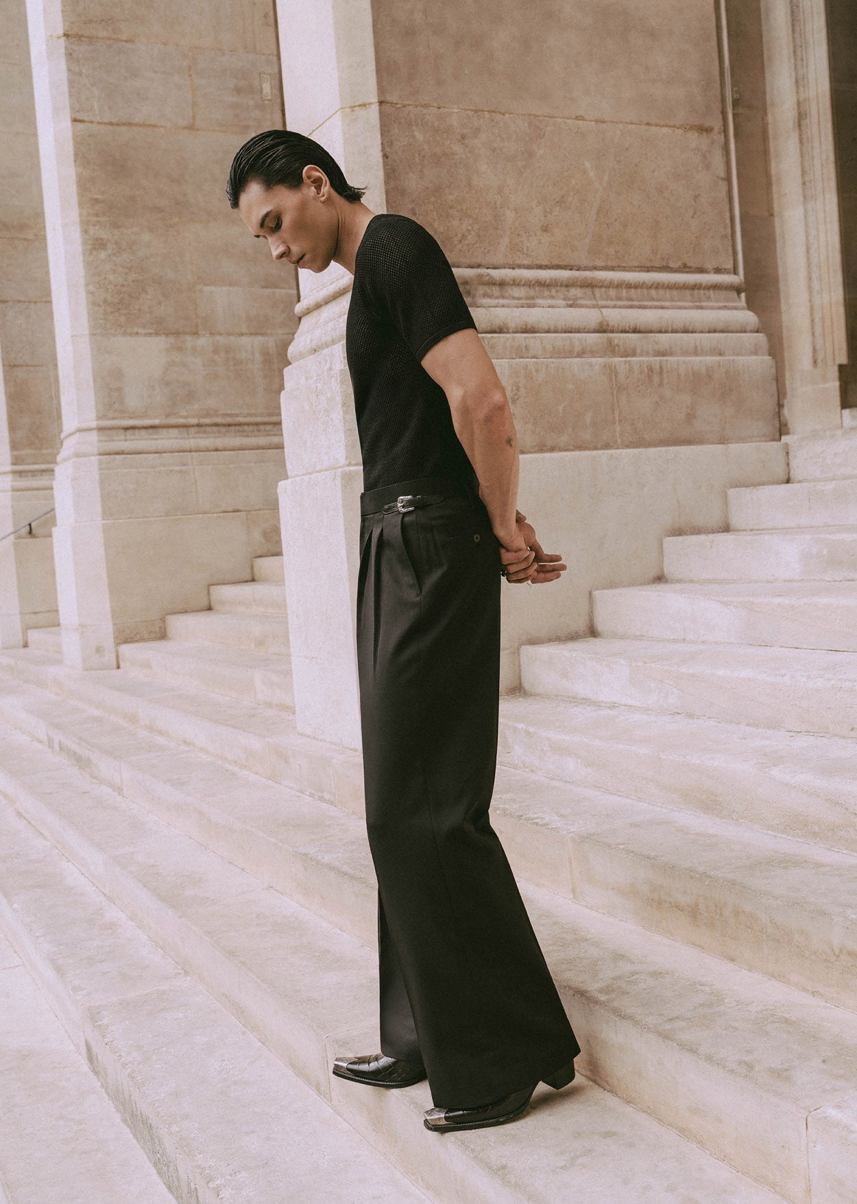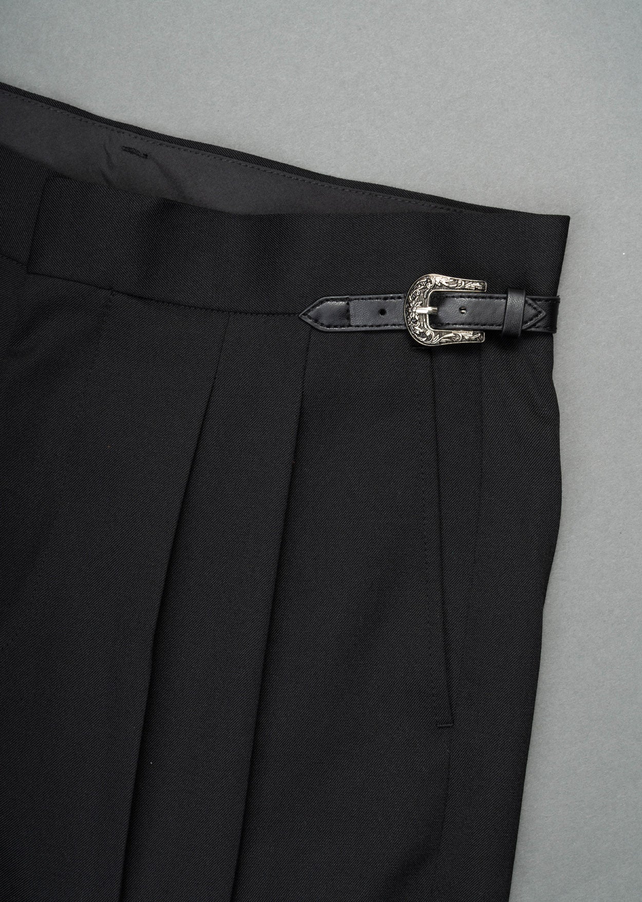 A defining detail and a definitive silhouette. This is the High Waisted Western Side Buckle Trouser, with a sleek, flare silhouette tailored to create a confident stature. Western style buckles at the waist provide a distinctive design detail, ensuring this piece is as versatile as it is unique.