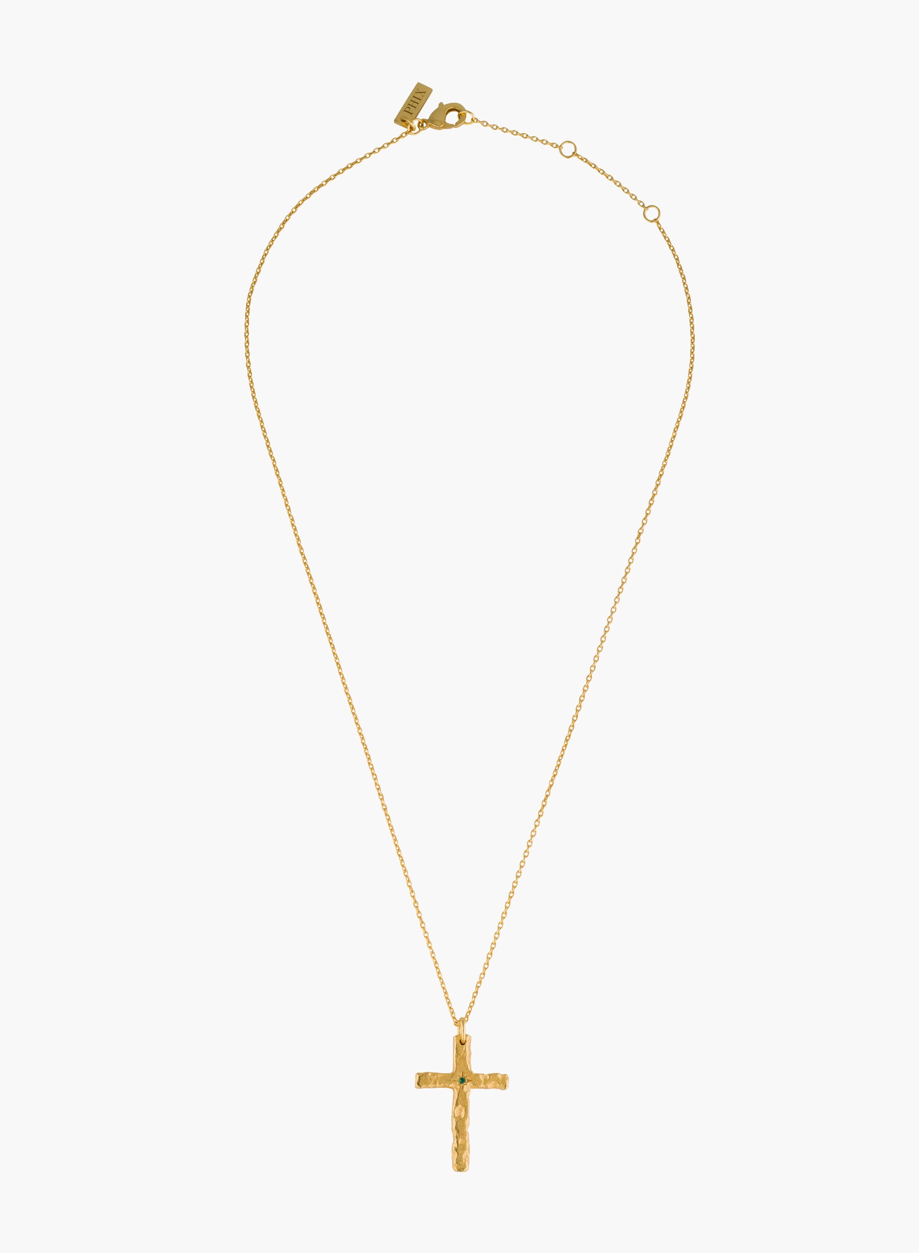 A sculptural cross pendant with a raw, tactile finish. The irregular surface gives the piece depth and individuality, while a small green stone sits at the centre, catching light subtly against the 18K gold-plated finish.
