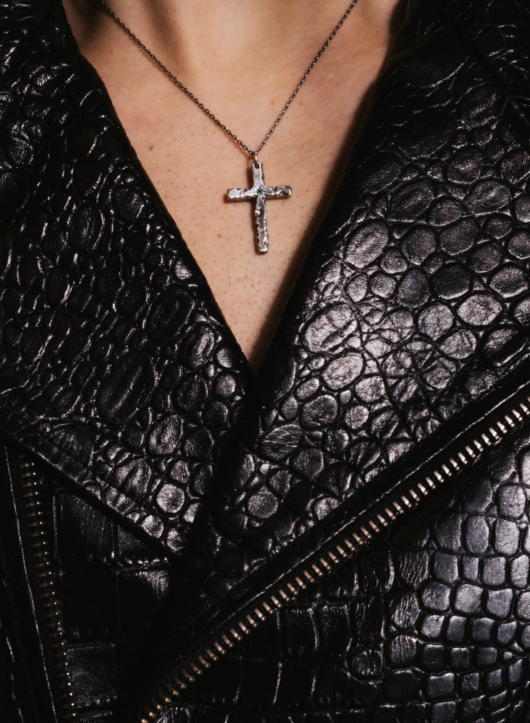A sculptural cross pendant with a raw, cracked and distressed finish. The irregular surface gives the piece depth and individuality, while a small green stone sits at the centre, catching light subtly against the sterling silver–plated finish.