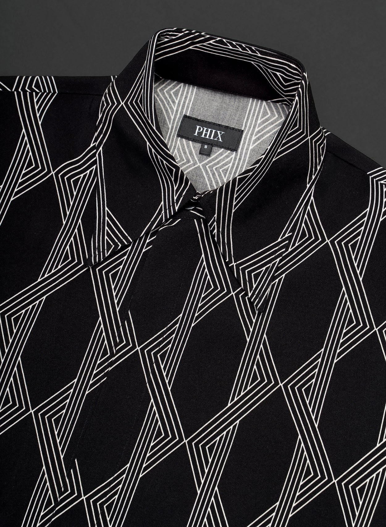 A new geometric viscose shirt, defined by our in-house designed Interlock Geometric pattern for AW25. The intricate lines of the pattern juxtapose with the effortless drape of the fabric, ensuring a piece that is as bold as it is refined, and highly breathable. This is modern menswear with retro flair.
