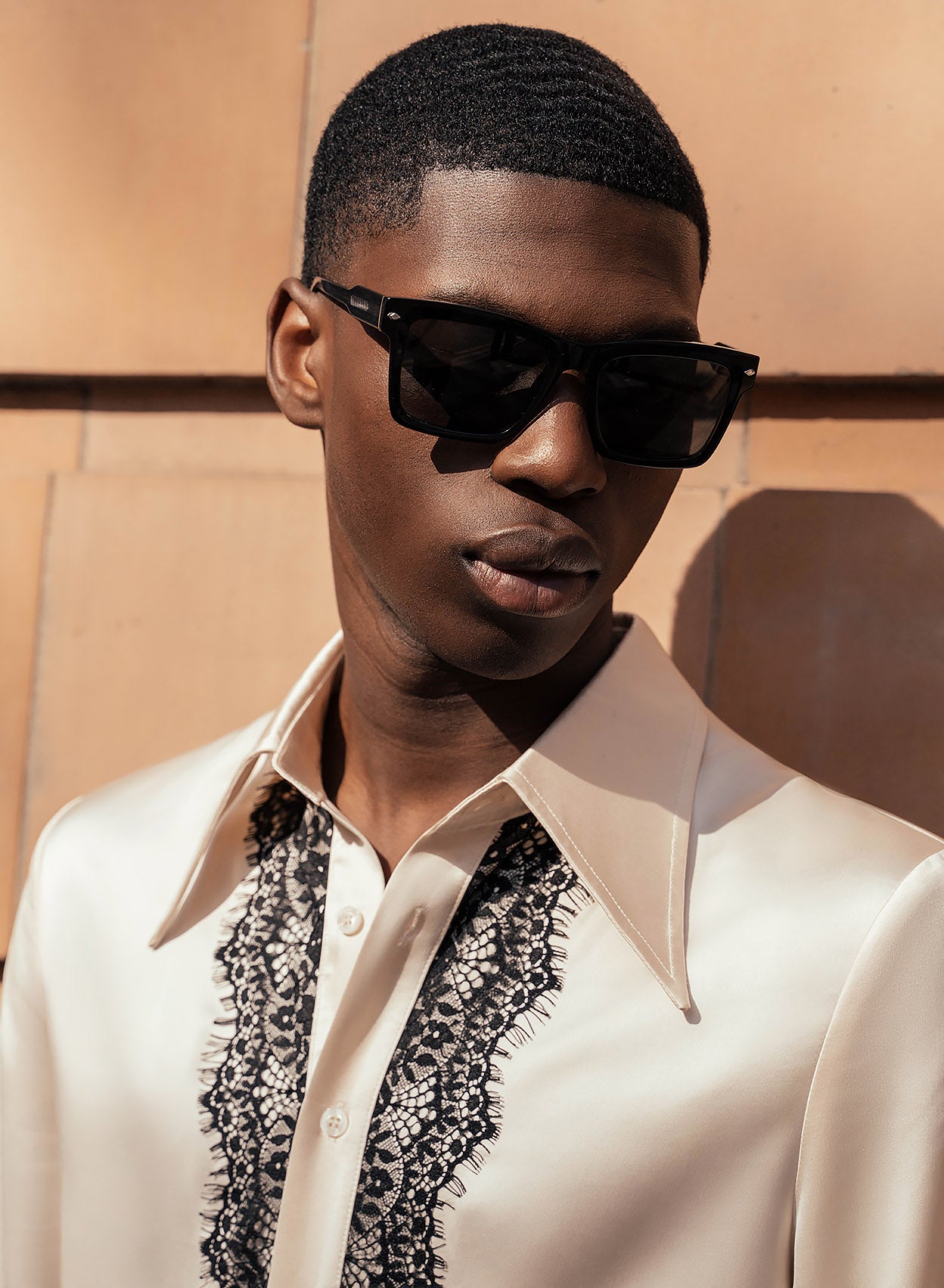 This Pearl satin shirt is defined by its intricate black lace lapel, which creates a bold contrast against the smooth, lustrous fabric. A sharply pointed collar enhances the structured design, while the buttoned front and long sleeves add a touch of classic tailoring. This refined statement piece seamlessly merges vintage elegance with distinctive details.